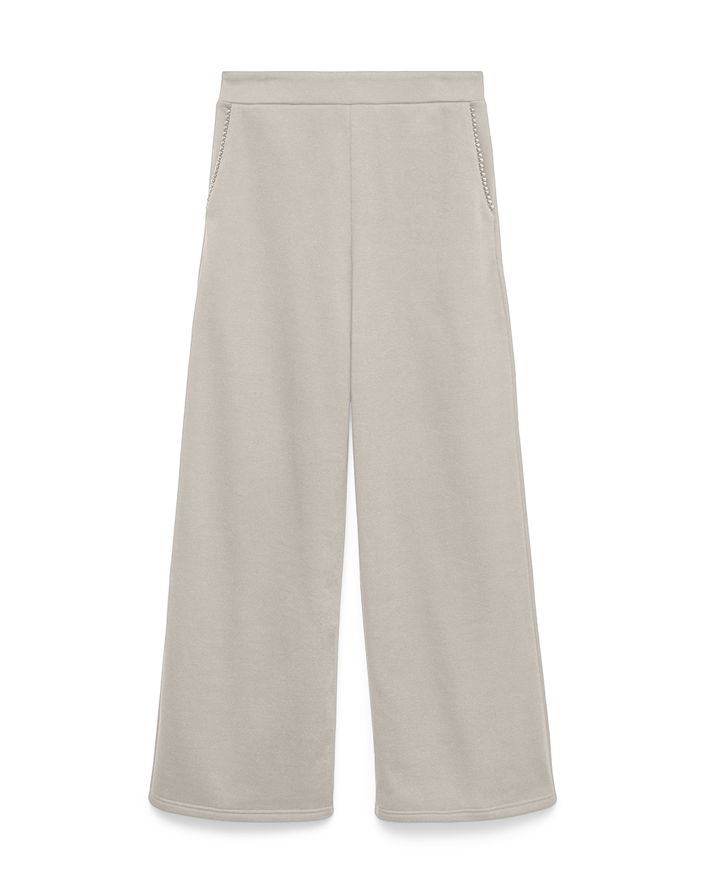 Women's wide-leg pants with side pockets and decorative pearl details. (Composition: 5% Recycled Polyester, 35% Cotton)