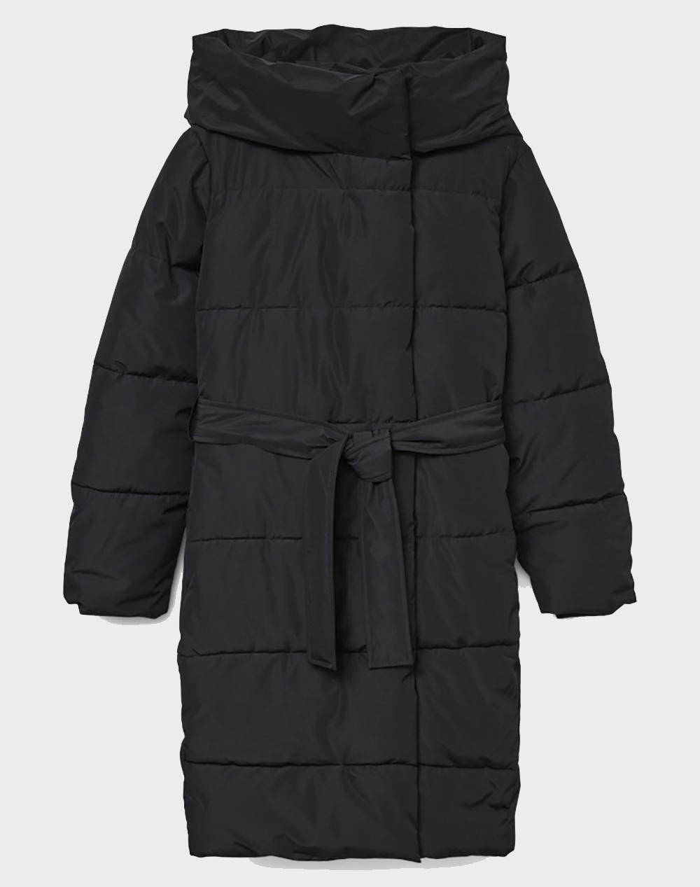 Women's long jacket, in a comfortable fit, with a high neckline, hood, and button and zipper closure. It features side pockets and a self-woven belt at the waist. (Composition: 100% Polyester, Lining: 100% Polyester)