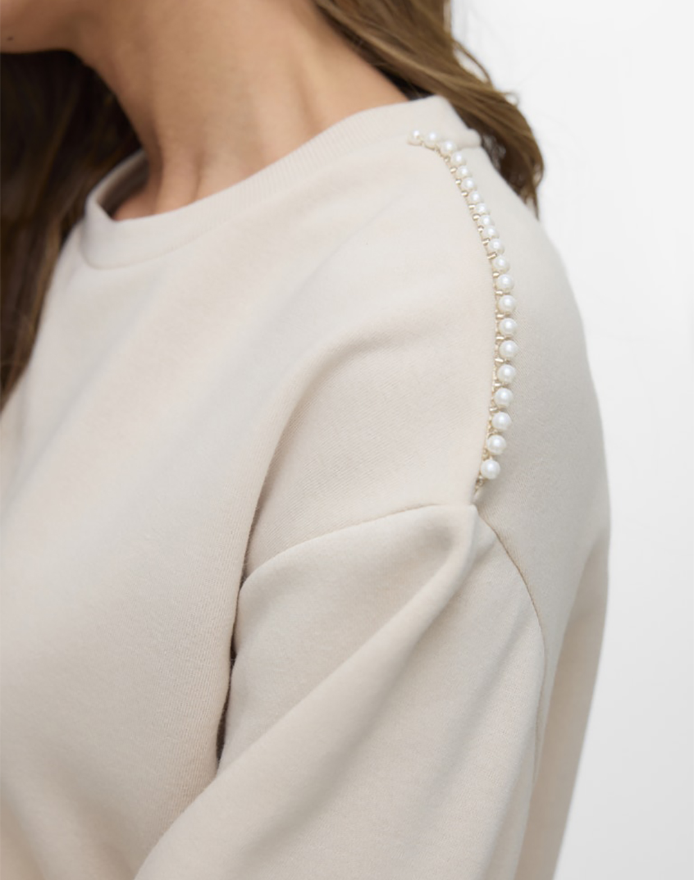 Women's sweatshirt, regular fit, long sleeve, with round neckline and pearl detail. (Composition: 65% Recycled Polyester, 35% Cotton)