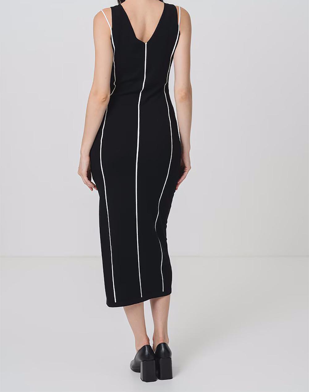 Γυναικείο φόρεμα, σε κανονική γραμμή, αμάνικο, με "V" λαιμόκοψη και πλάτη, ρίγες σε αντίθεση και σκίσιμο στο κάτω μέρος. (Σύνθεση: 76% Βισκόζη, 24% Πολυαμίδιο)