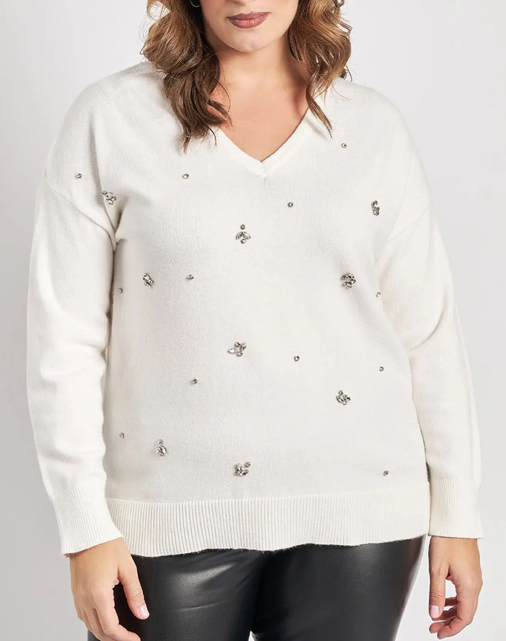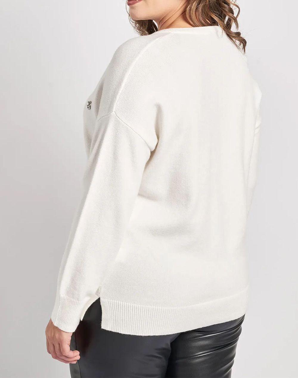 Women's knitted top, long-sleeved, solid color, with V-neck and decorative elements. (Composition: 58% Viscose, 42% Polyamide)
