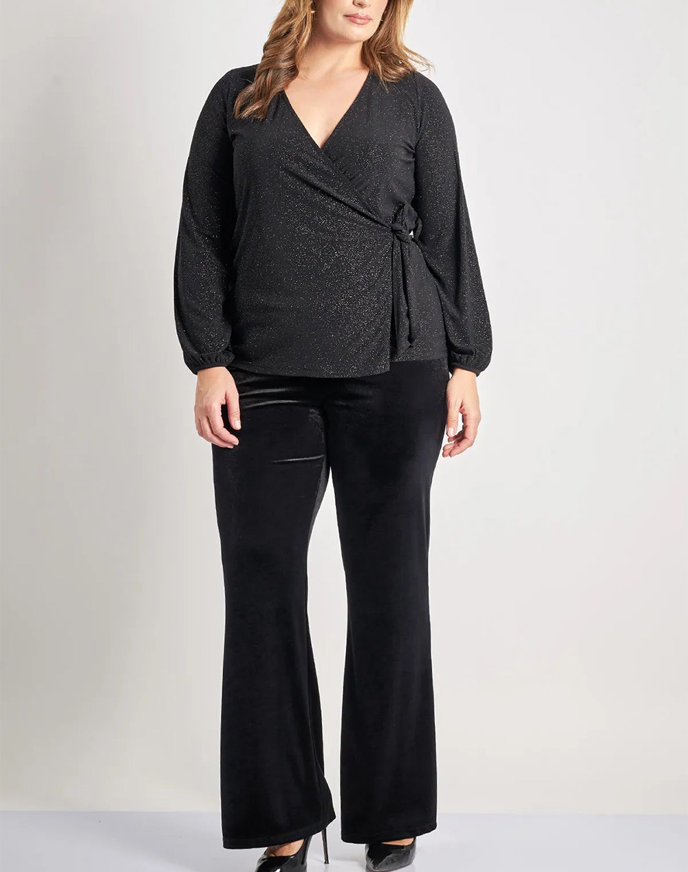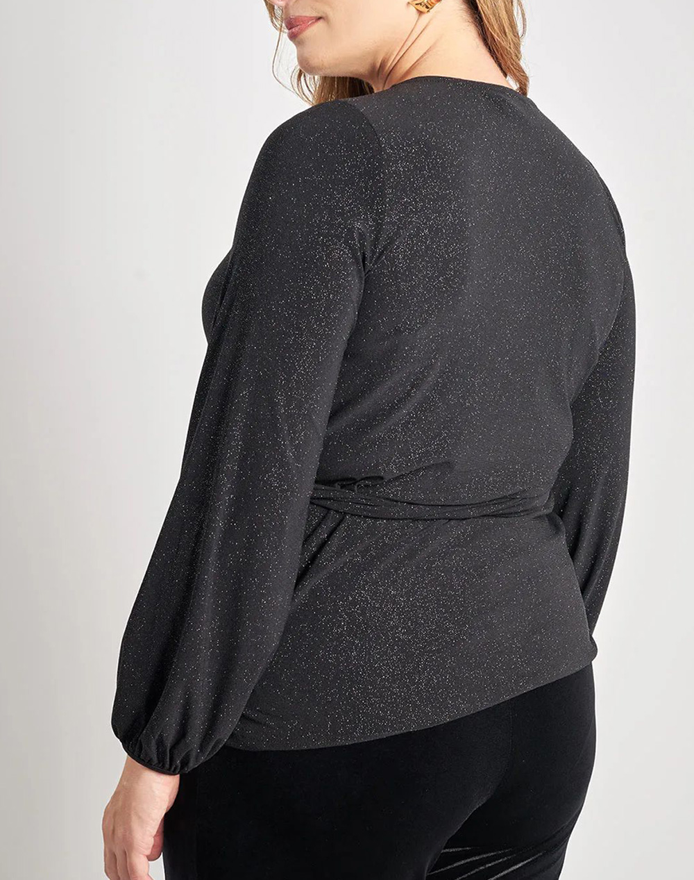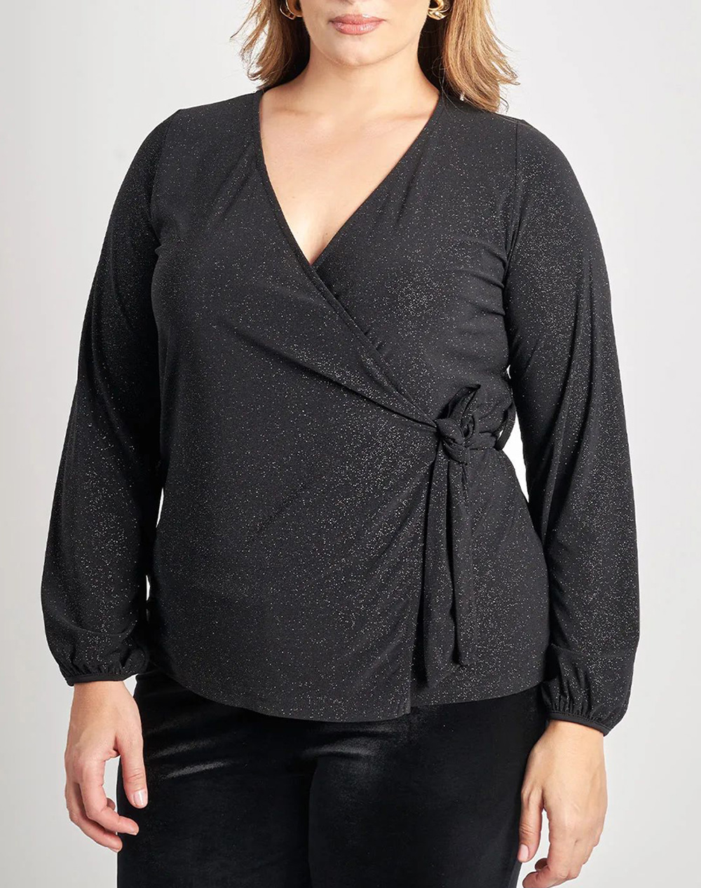 Γυναικεία κρουαζέ μπλούζα, μακρυμάνικη, με "V" λαιμόκοψη, διακόσμηση lurex και μπροστινό δέσιμο. (Σύνθεση: 95% Πολυεστέρας, 5% Ελαστάνη)