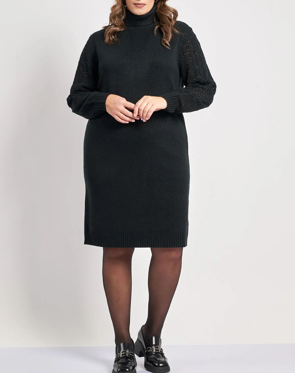 Women's knitted dress, long-sleeved, in a straight, comfortable line, with a high neck and openwork knitting on the sleeves. (Composition: 95% Acrylic, 5% Elastane)