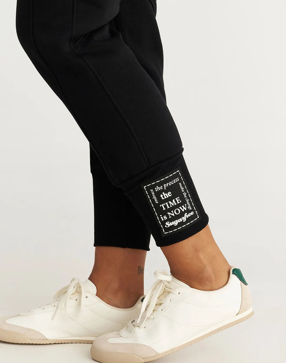 Γυναικείο παντελόνι φόρμας, σε ίσια γραμμή, ψηλόμεσο, με πλαϊνές τσέπες και φαρδύ λάστιχο στο τελείωμα με λεπτομέρειεα τυπωμένο κείμενο. (Σύνθεση: 65% Βαμβάκι, 35% Πολυεστέρας)
