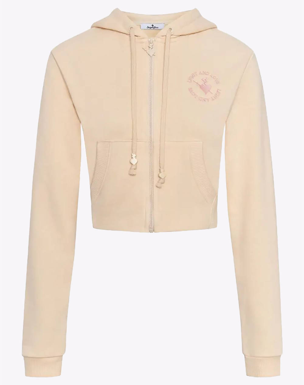 Γυναικεία κοντή ζακέτα, σε κανονική γραμμή, μονόχρωμη, μακρυμάνικη, με κουκούλα με ρυθμιζόμενο κορδόνι, τσέπη καγκουρό και κλείσιμο με φερμουάρ. (Σύνθεση: 65% Βαμβάκι, 35% Πολυεστέρας)