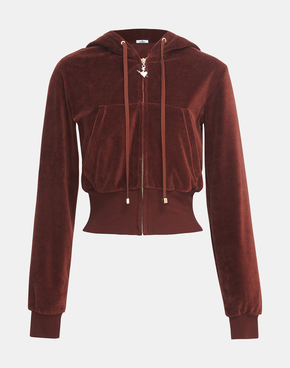 Women's short cardigan, with velvet texture, hood with adjustable drawstring, front kangaroo pockets, wide elastic waist and zipper closure. (Composition: 80% Cotton, 20% Polyester)
