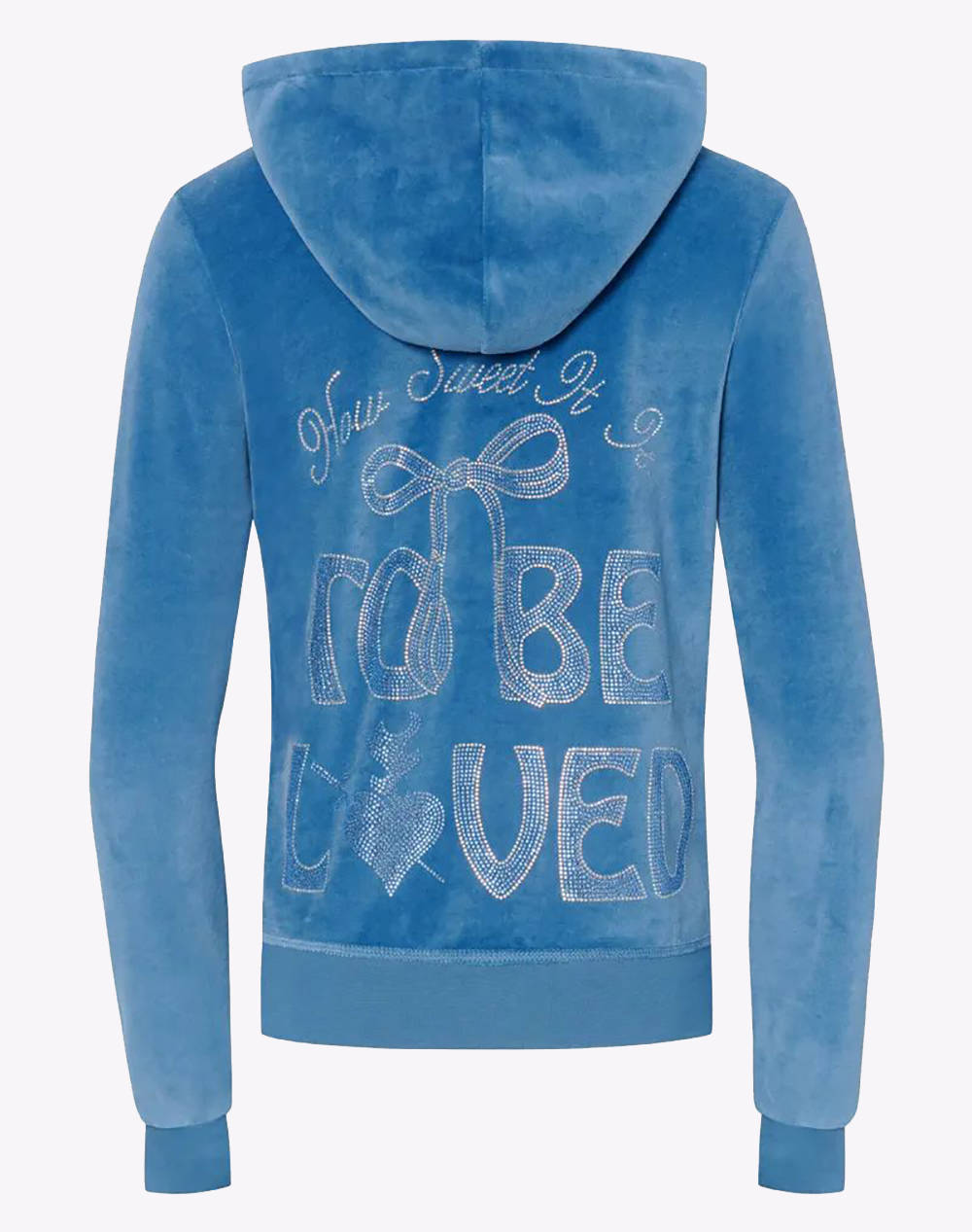 Γυναικεία βελουτέ ζακέτα, με κουκούλα, μπροστινές καγκουρό τσέπες, στρας στο πίσω μέρος, λάστιχο στη μέση και κλείσιμο με φερμουάρ. (Σύνθεση: 80% Βαμβάκι, 20% Πολυεστέρας)
