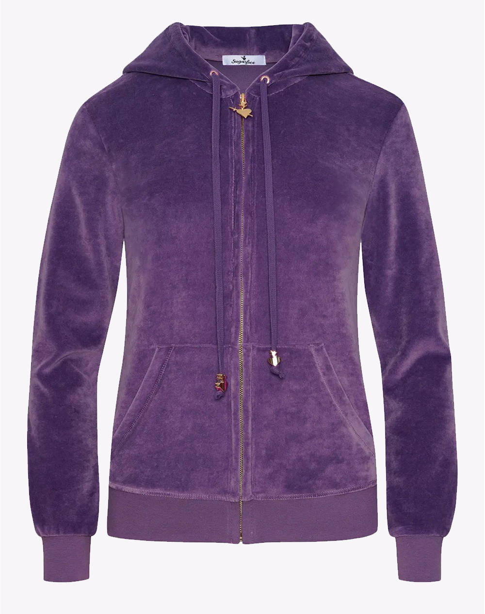 Women's sports jacket, solid color, long sleeves, with velvet texture, hood with adjustable drawstring, elastic waist, front pockets and zipper closure. (Composition: 80% Cotton, 20% Polyester)