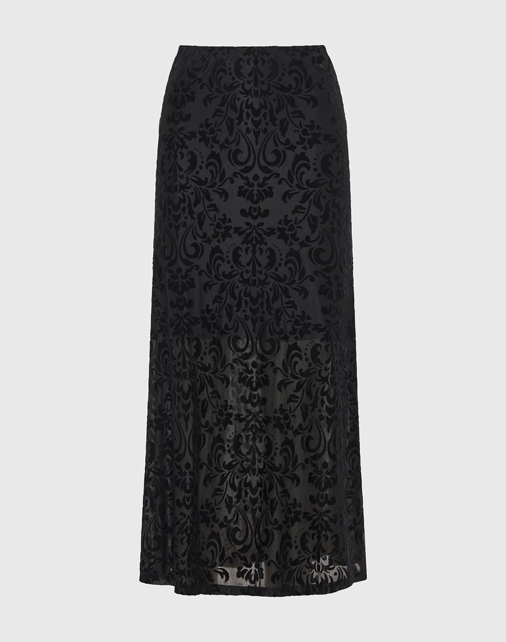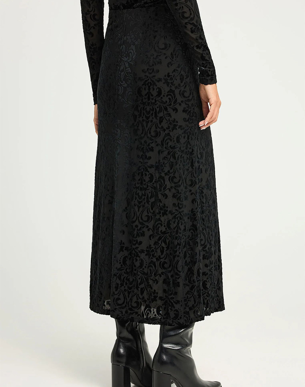 Γυναικεία μάξι φούστα, σε κανονική, ίσια γραμμή, ψηλόμεση, με βελούδινη υφή και ανάγλυφο τύπωμα. (Σύνθεση: 59% Πολυεστέρας, 30% Πολυαμίδιο, 11% Ελαστομερής Πολυουρεθάνη)