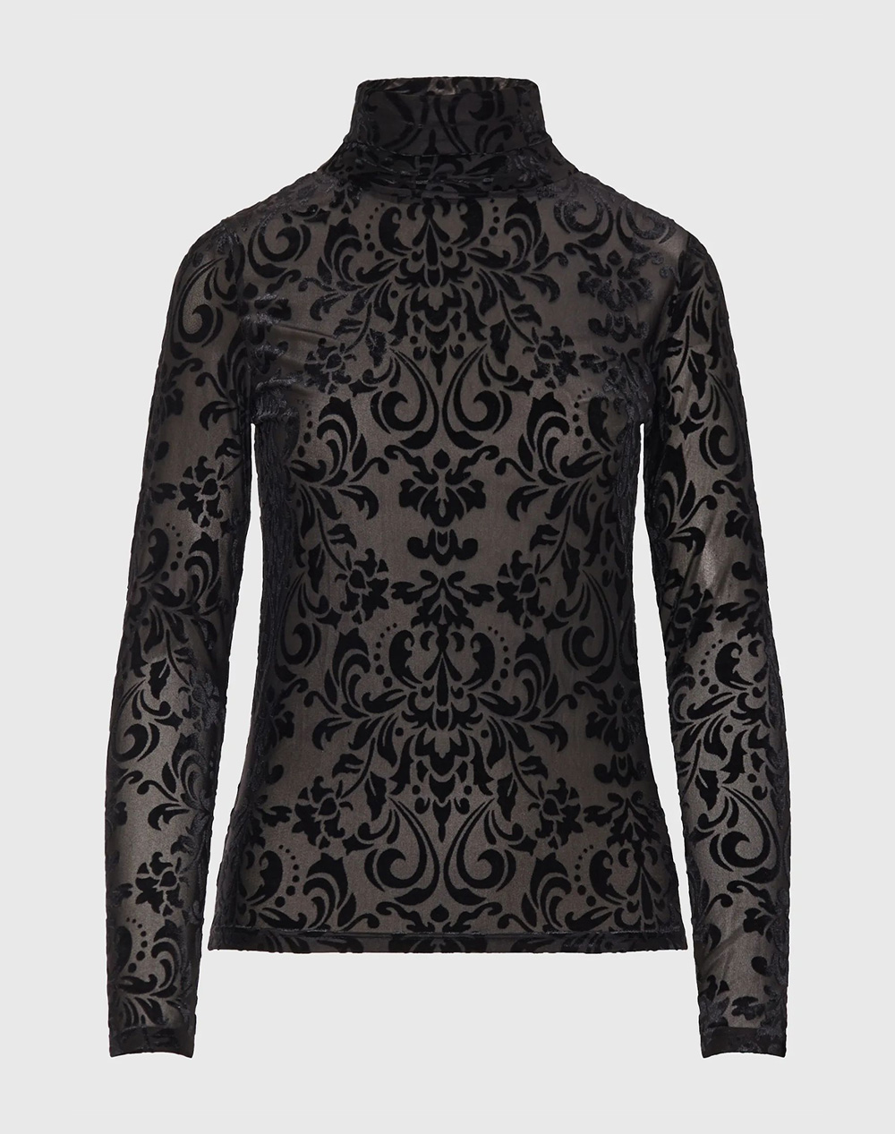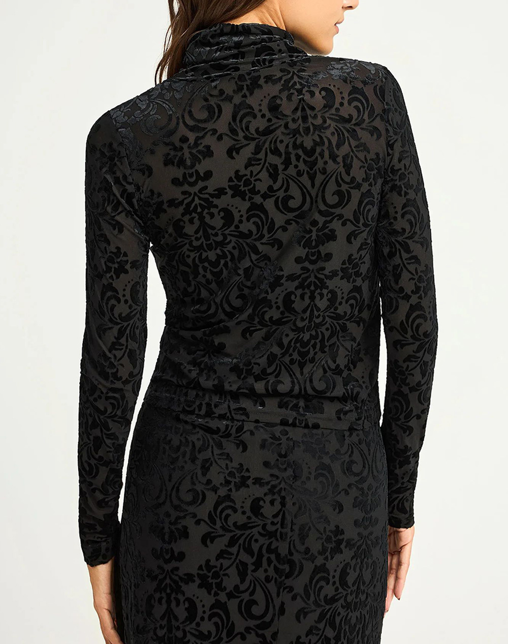 Γυναικεία μπλούζα, σε εφαρμοστή γραμμή, μακρυμάνικη, με ψηλό λαιμό, ανάγλυφο τύπωμα και βελούδινη υφή. (Σύνθεση: 59% Πολυεστέρας, 30% Πολυαμίδιο, 11% Ελαστομερής Πολυουρεθάνη)