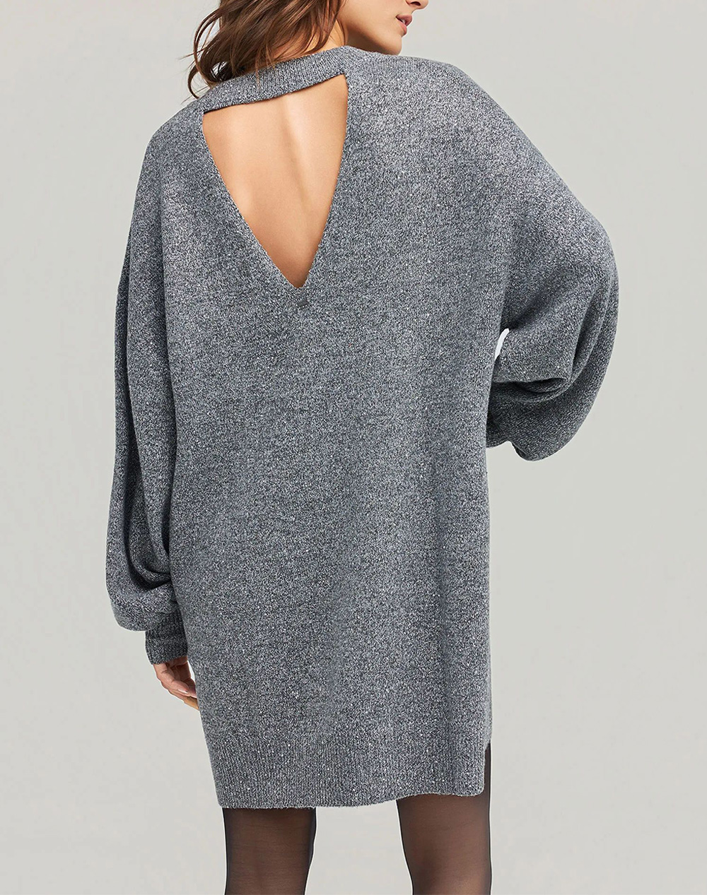 Γυναικείο πλεκτό φόρεμα, σε άνετη γραμμή, μακρυμάνικο, με στρογγυλή λαιμόκοψη, ανοιχτή πλάτη και balloon μανίκια. (Σύνθεση: 66% Ακρυλικό, 30% Πολυεστέρας, 4% Μεταλλική Ίνα)