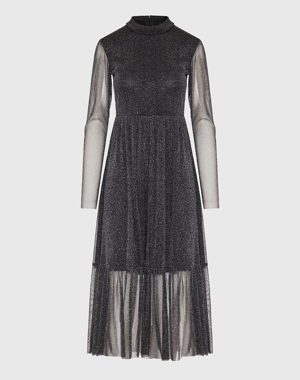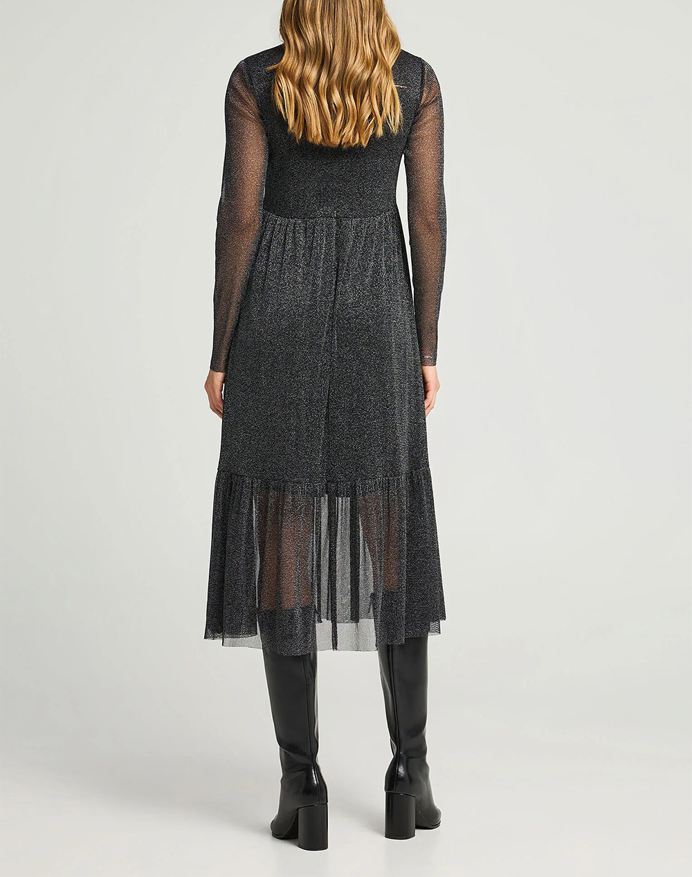 Γυναικείο μίντι φόρεμα, σε κανονική, άλφα γραμμή, μακρυμάνικο, με διαφάνειες στα μανίκια και στο κάτω μέρος και κλείσιμο με φερμουάρ στη πλάτη. (Σύνθεση: 95% Πολυεστέρας, 3% Ελαστομερής Πολυουρεθάνη, 2% Μεταλλική Ίνα)