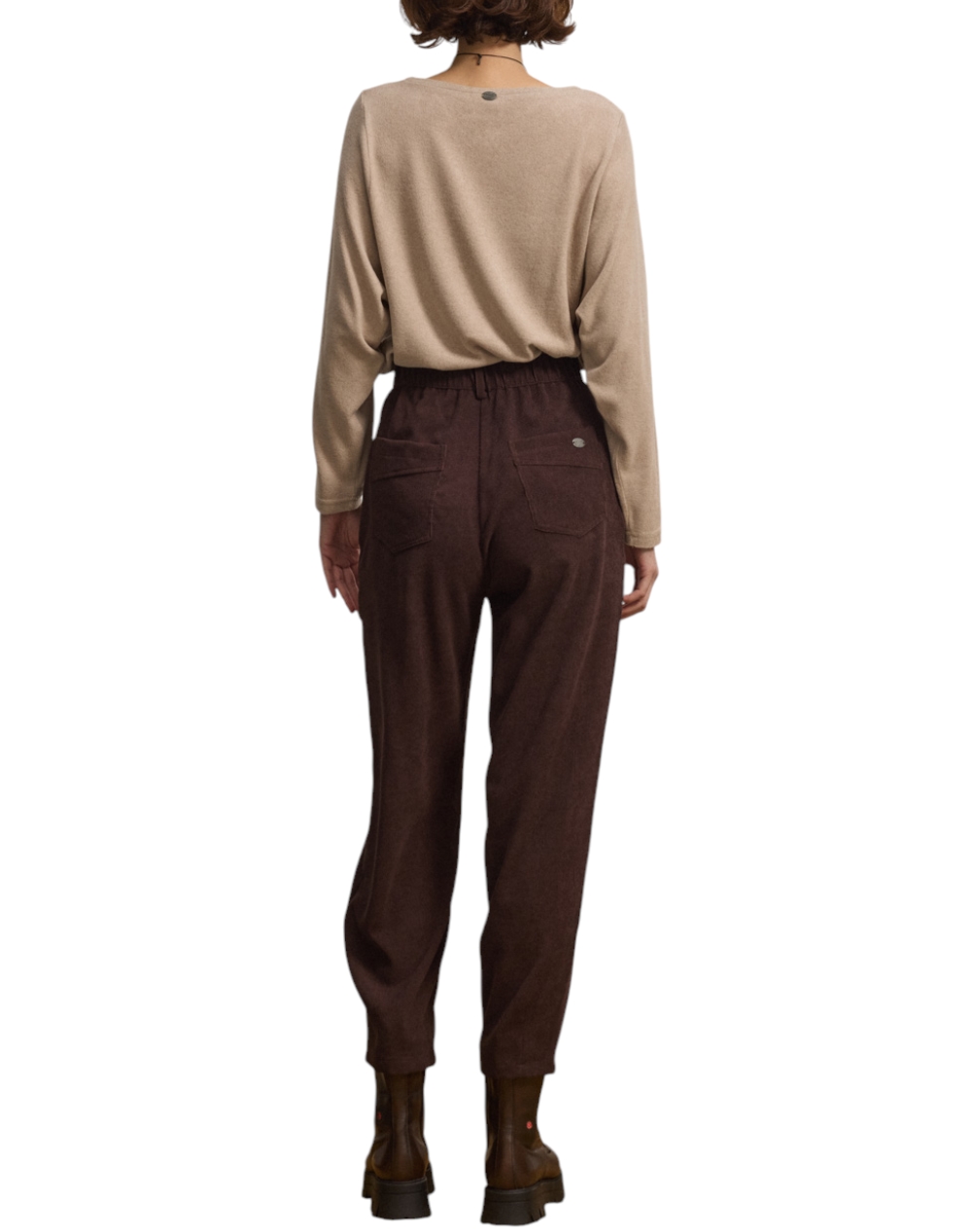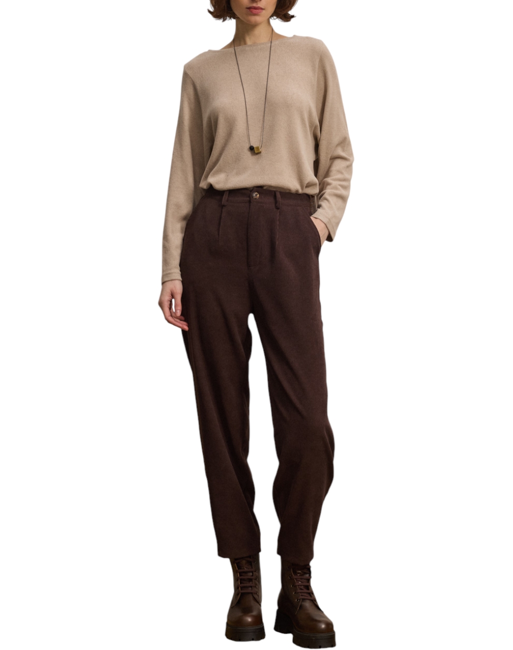 Γυναικείο κοτλέ παντελόνι, σε άνετη γραμμή, ψηλόμεσο, με πιέτες μπροστά, λάστιχο στο πίσω μέρος, τσέπες και κλείσιμο μπροστά με κουμπί και φερμουάρ. (Σύνθεση: 98% Πολυεστέρας, 2% Ελαστάνη)