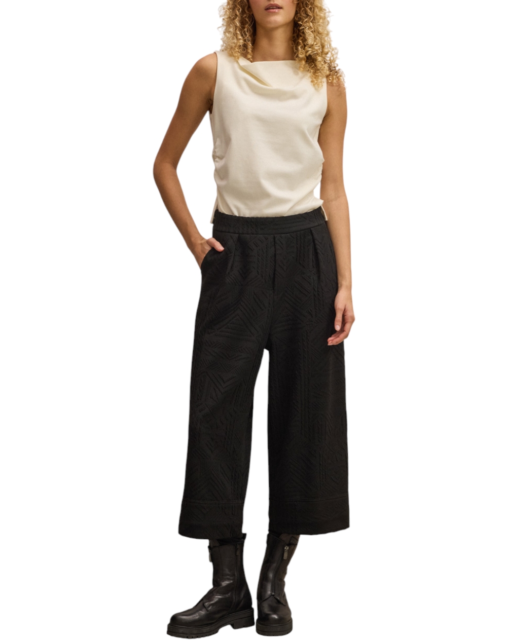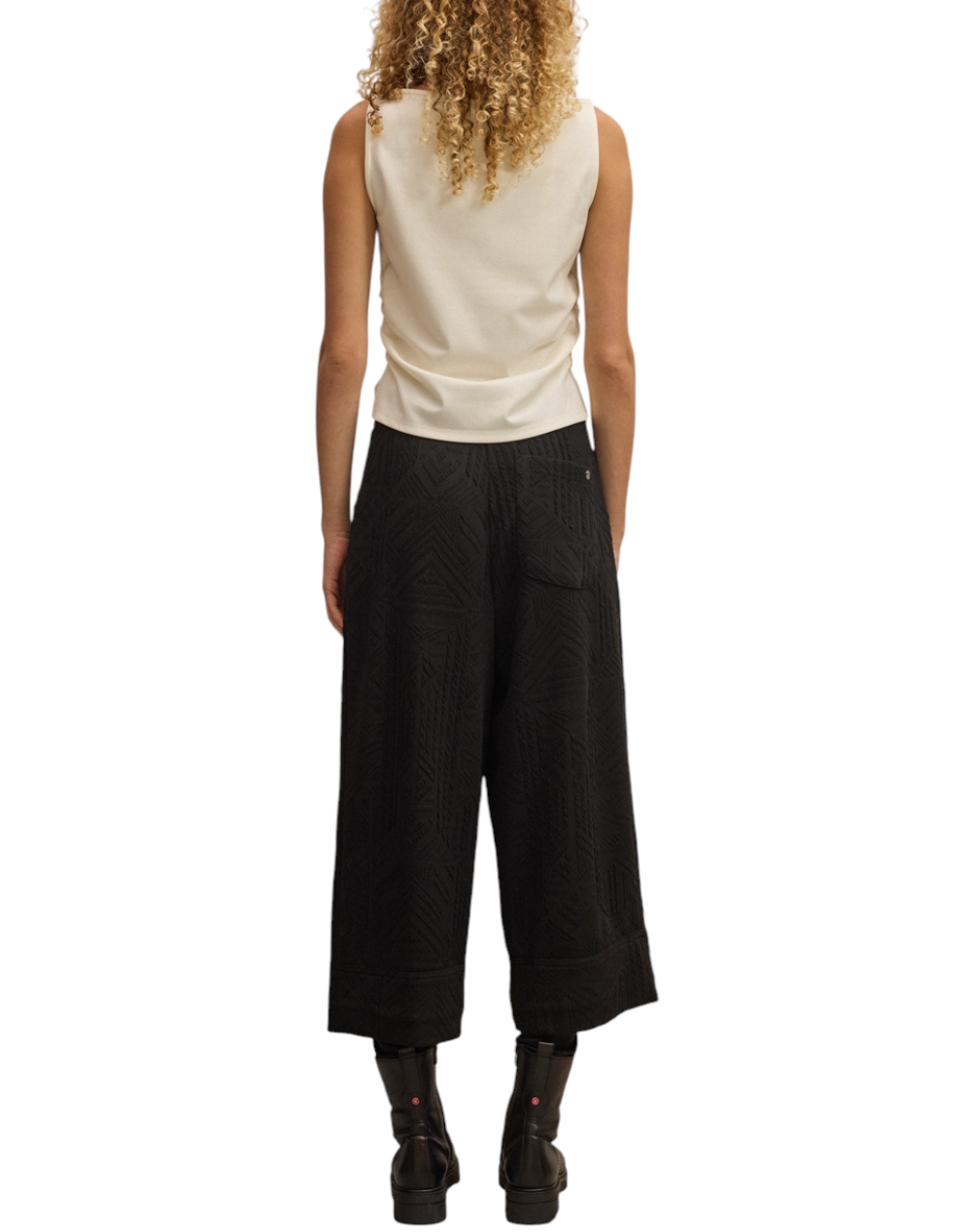 Women's straight-leg pants, cropped length, textured fabric with geometric patterns, pockets and elastic at the back waist. (Composition: 48% Viscose, 47% Polyester, 8% Elastane)