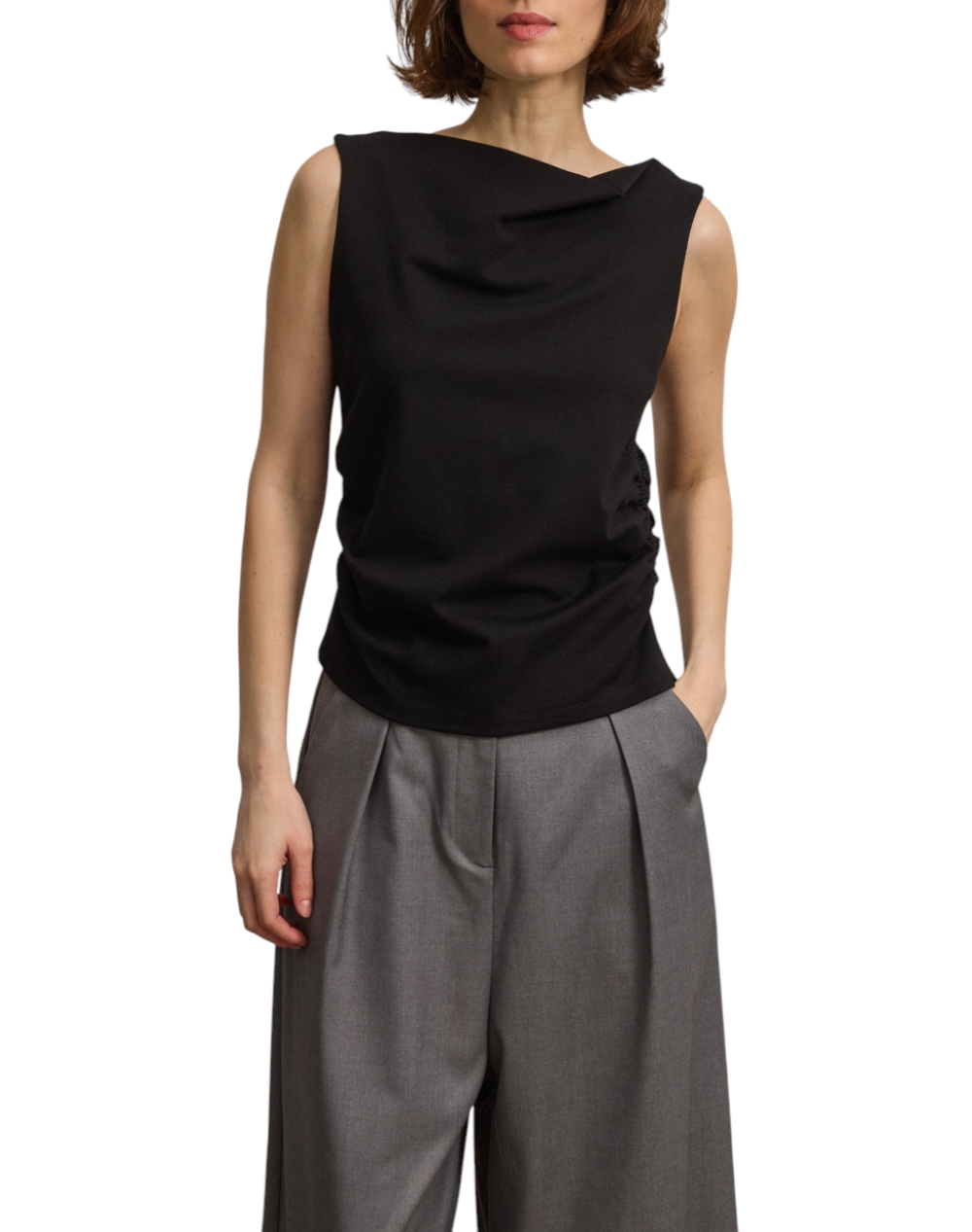 Women's sleeveless top, with elastic texture, draped neckline and ruffles on the sides. (Composition: 70% Viscose, 25% Polyamide, 5% Elastane)