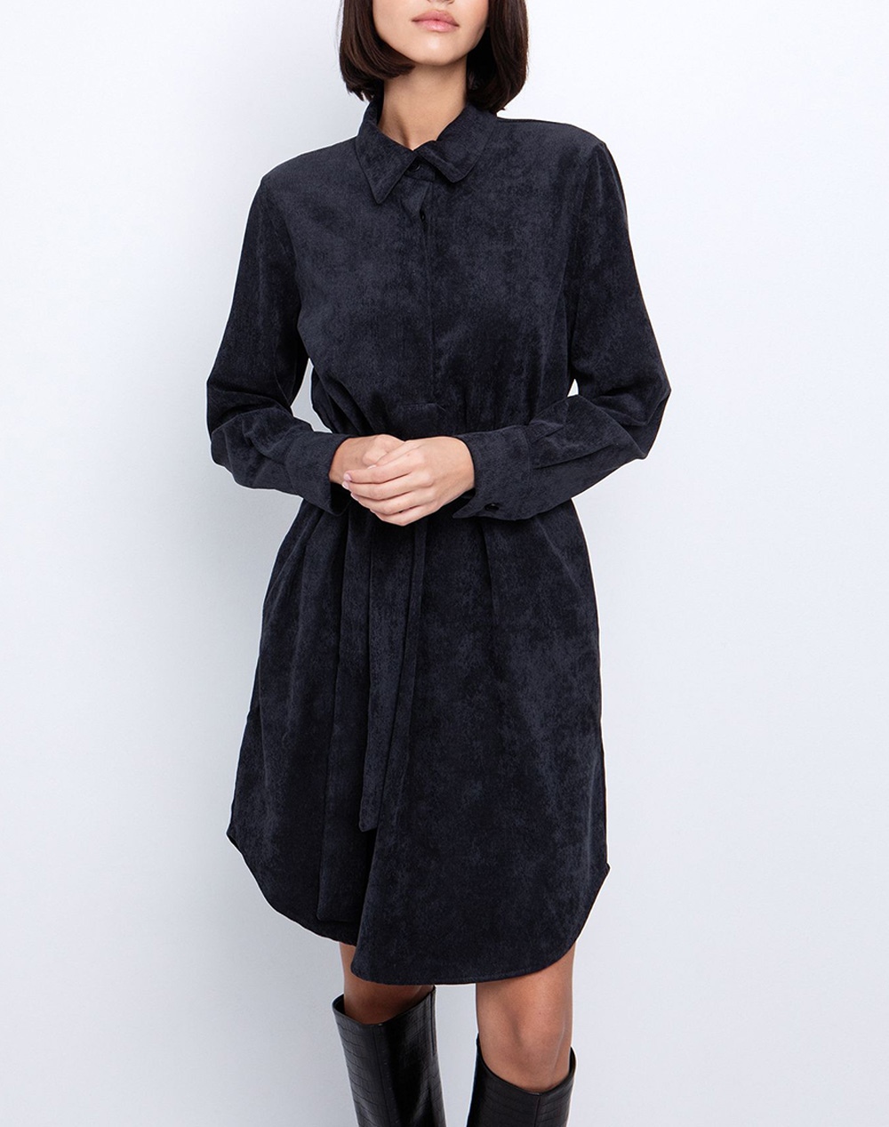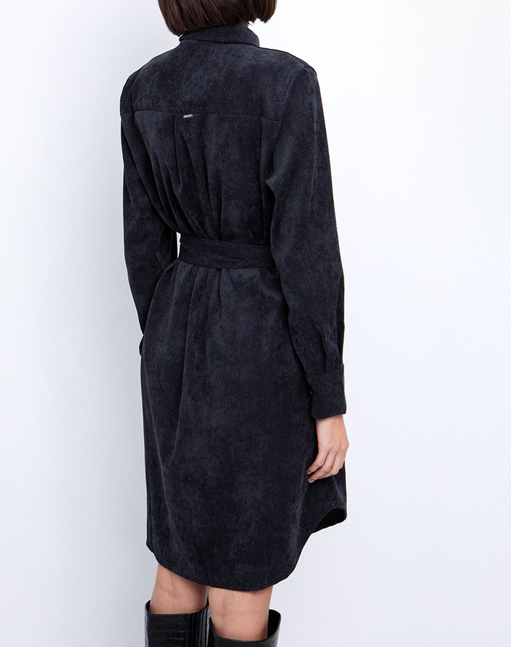 Women's short dress, in a loose fit, long sleeves, with corduroy, velvet weave, side pockets and matching belt at the waist. (Composition: 87% Polyester, 10% Polyamide, 3% Elastane)