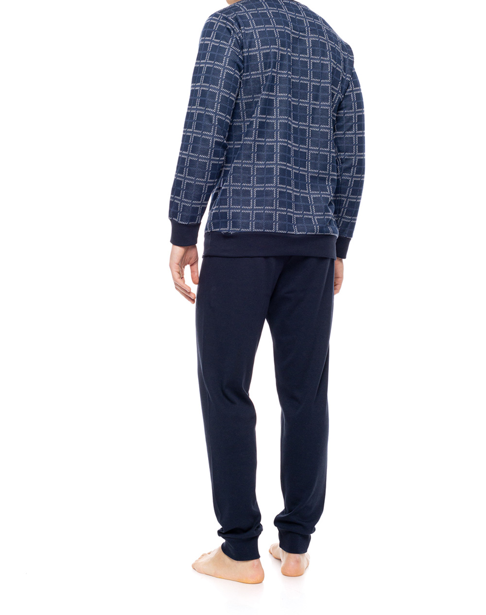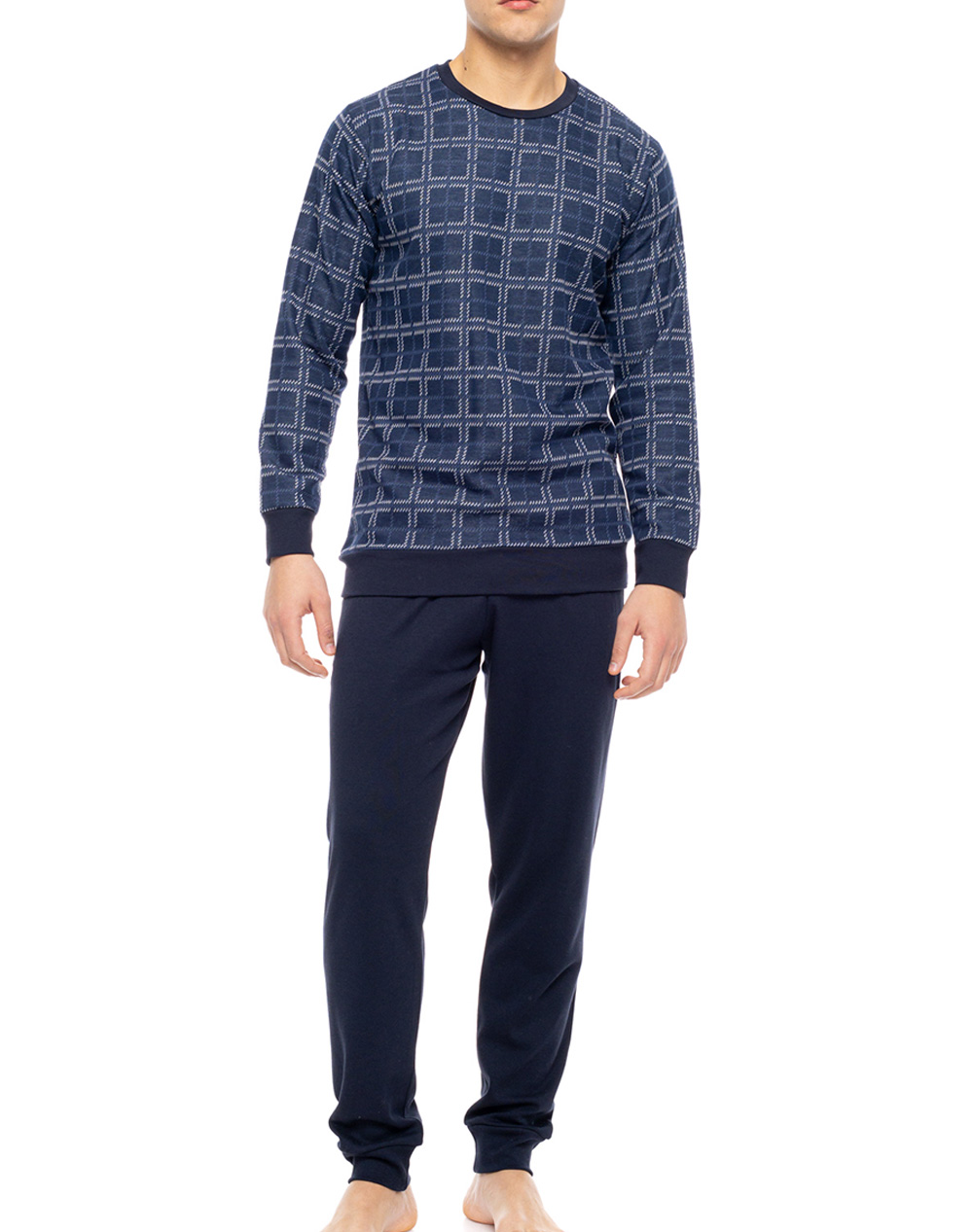 Ανδρική πυτζάμα, διαθέτει μακρυμάνικη εμπριμέ μπλούζα με στρογγυλή λαιμόκοψη και μονόχρωμο παντελόνι με ελαστικό τελείωμα. (Σύνθεση: 100% Βαμβάκι)