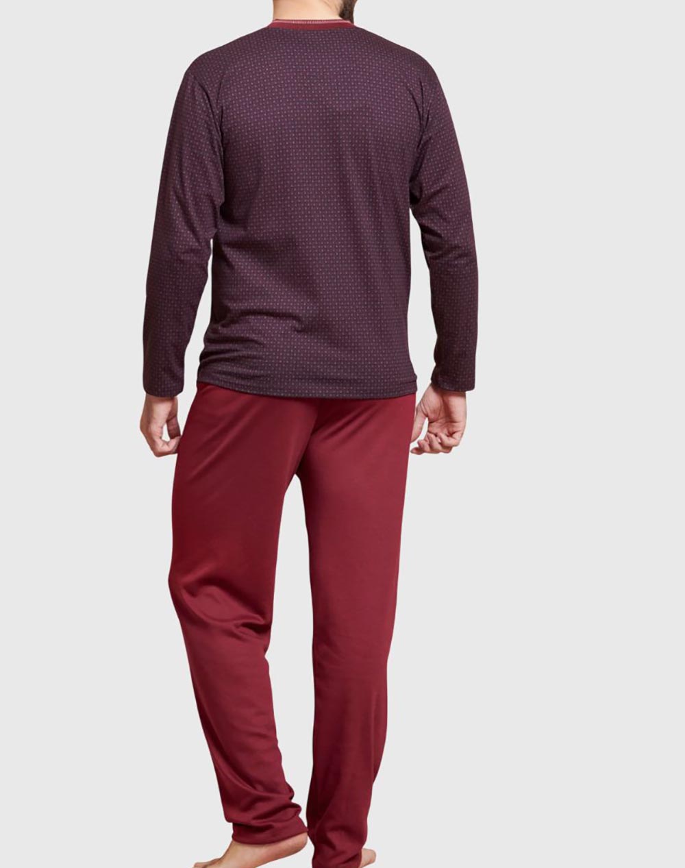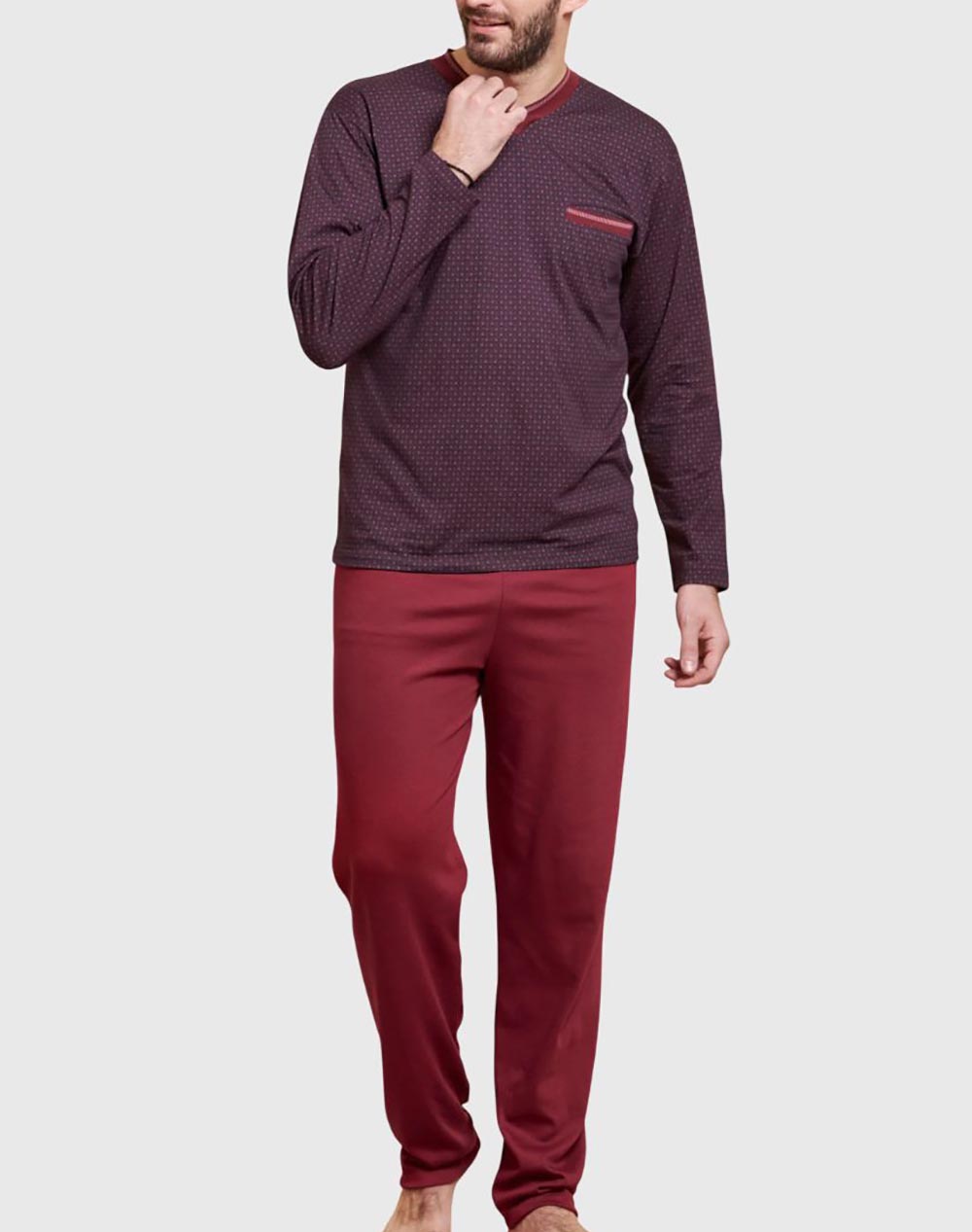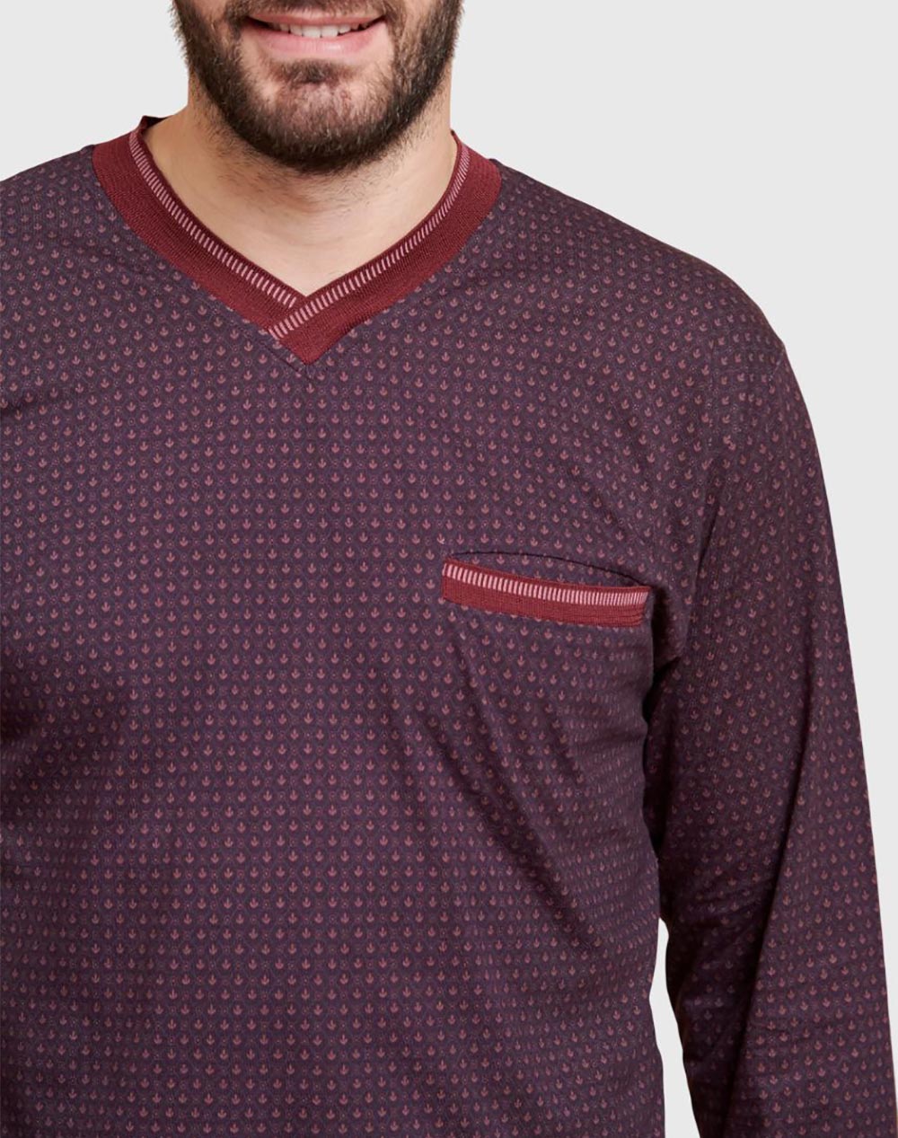 Ανδρική πυτζάμα, σε κανονική γραμμή, με μακρυμάνικη μπλούζα, με μικροσχέδιο και V λαιμόκοψη και μονόχρωμο παντελόνι με ελαστική μέση. (Σύνθεση: 100% Βαμβάκι)