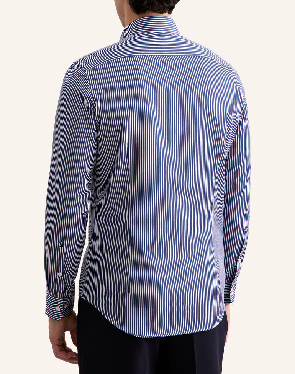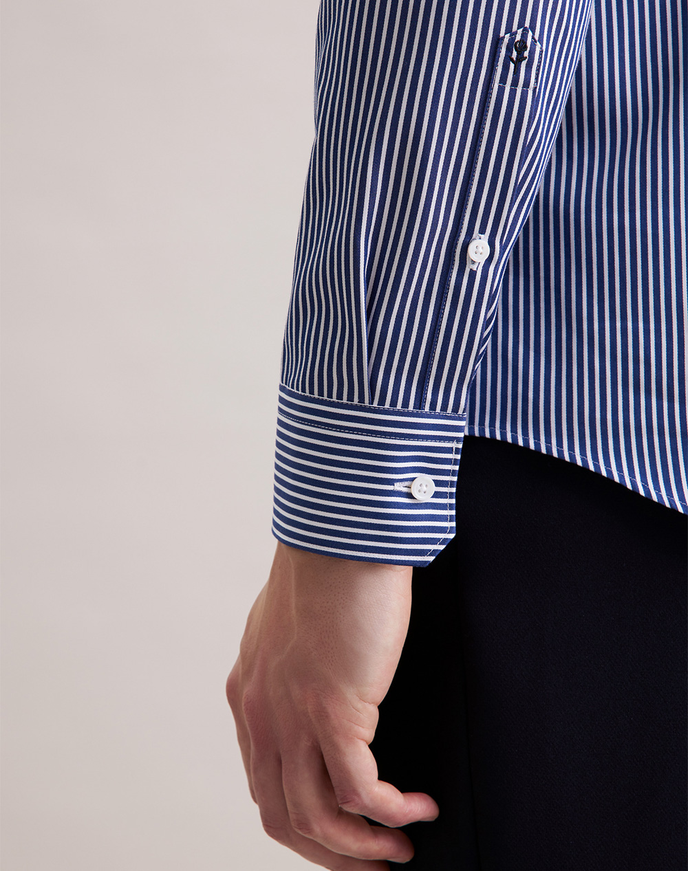Ανδρικό πουκάμισο, σε εφαρμοστή γραμμή, μακρυμάνικο, με γιακά Kent, βαμβακερή σατέν ύφανση, ριγέ μοτίβο και κλείσιμο μπροστά με κουμπιά. Με τεχνολογία για εύκολο σιδέρωμα. (Σύνθεση: 100% Βαμβάκι)
