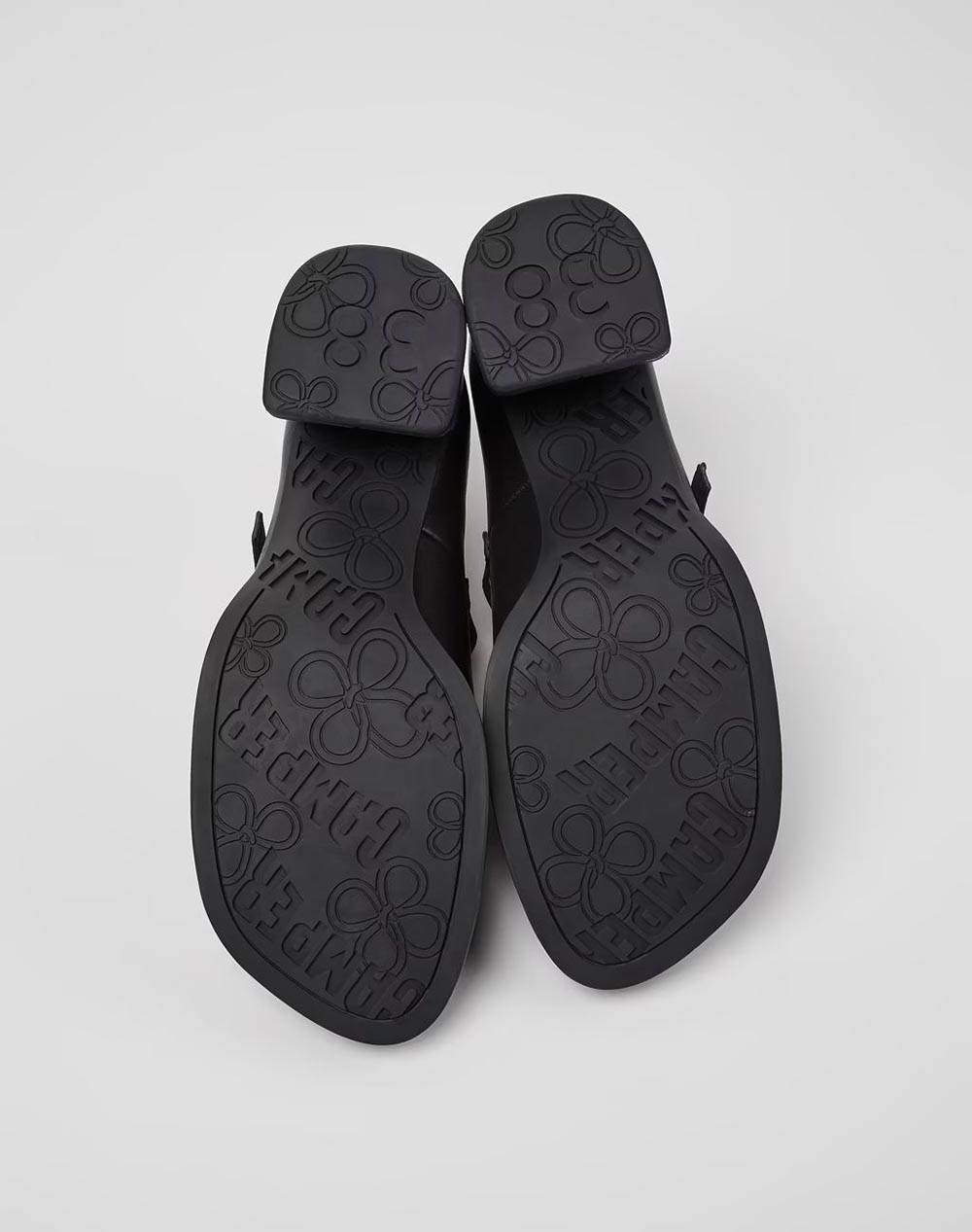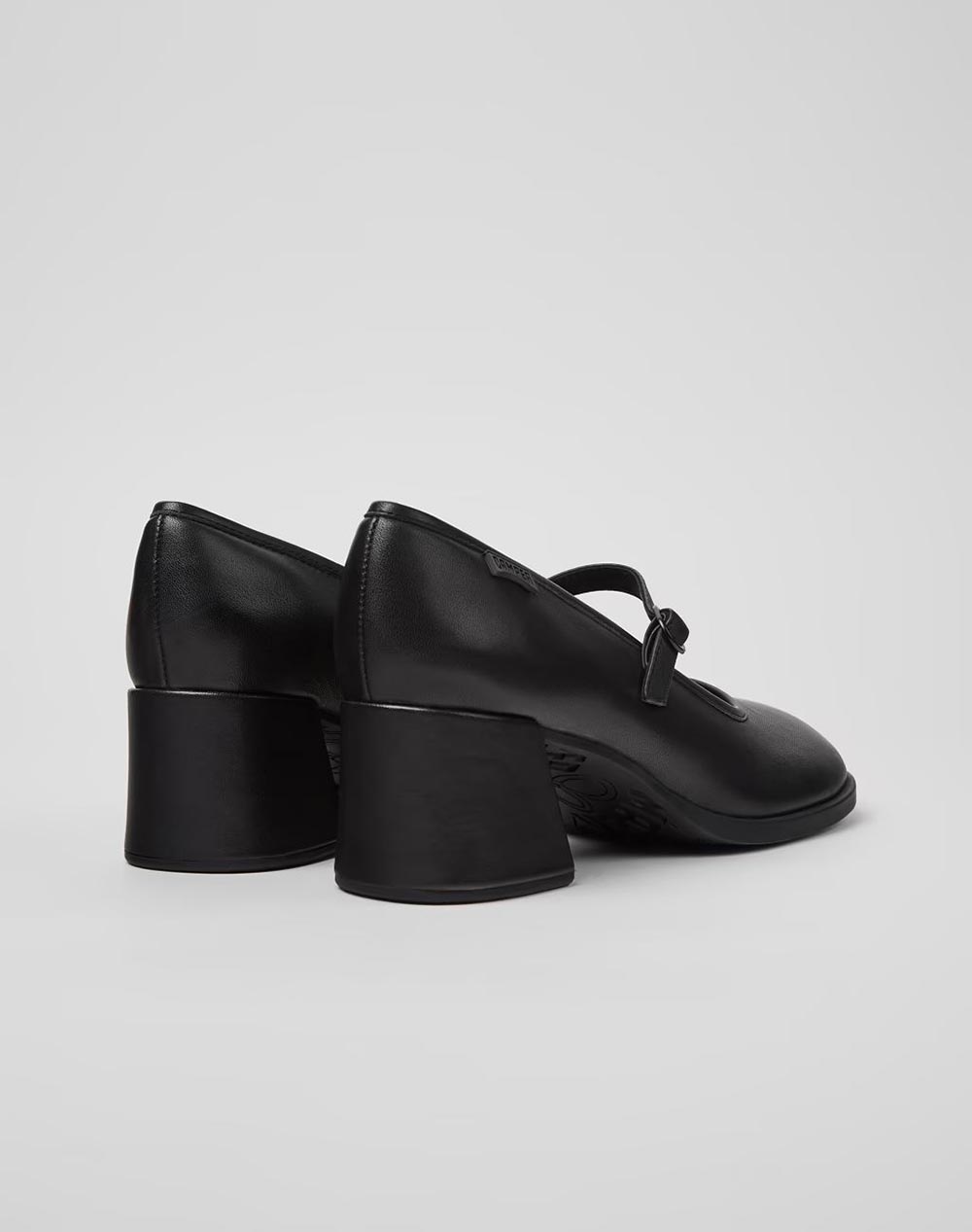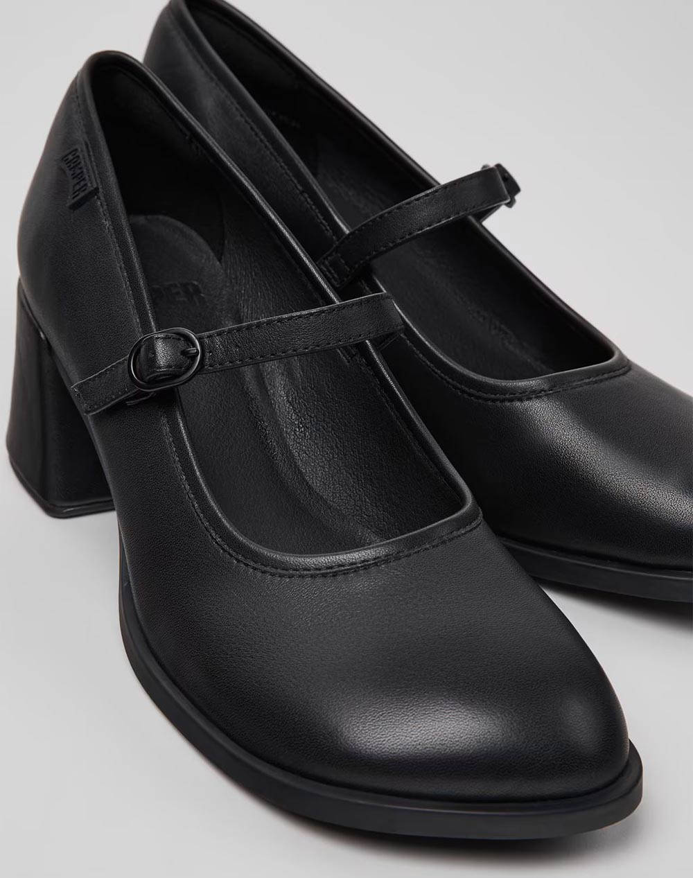 Women's heels, with a round, reinforced toe and a pin buckle closure. (Composition: Leather)
