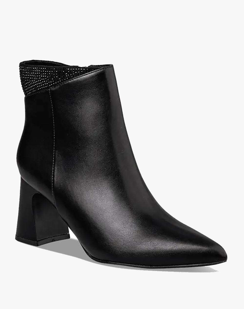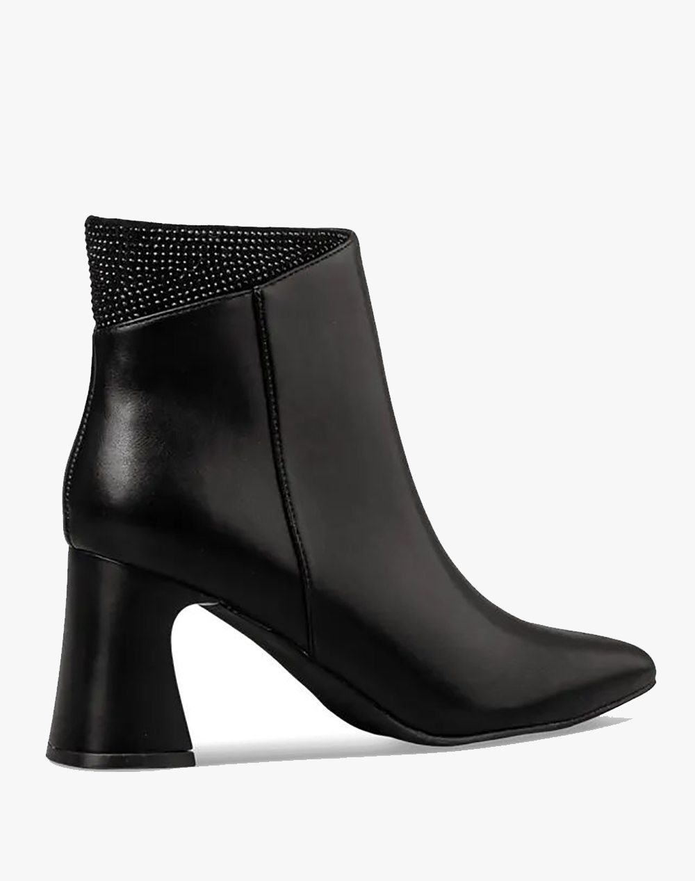 Women's ankle boots, with a pointed toe, elastic sole, rhinestone detail on the upper and zipper on the side. Heel height: 7cm. (Composition: Patent Leather, Synthetic Leather)