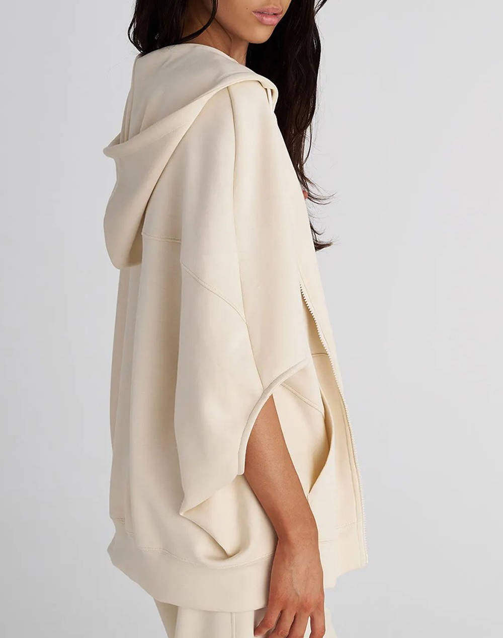 Γυναικεία ζακέτα φούτερ, σε άνετη γραμμή, μονόχρωμη, με μανίκια 3/4, κουκούλα με ρυθμιζόμενο κορδόνι, μπροστινές τσέπες καγκουρό και κλείσιμο με φερμουάρ. (Σύνθεση: 51% Rayon, 43% Πολυεστέρας, 6% Spandex).