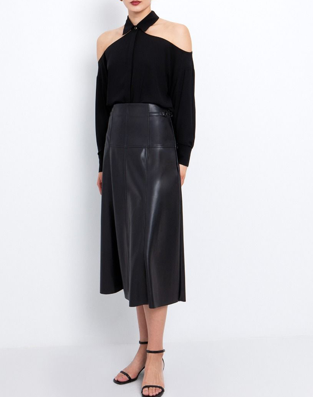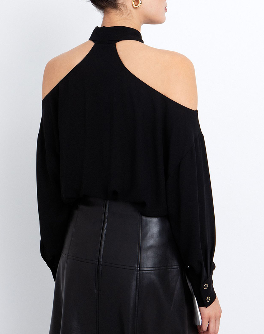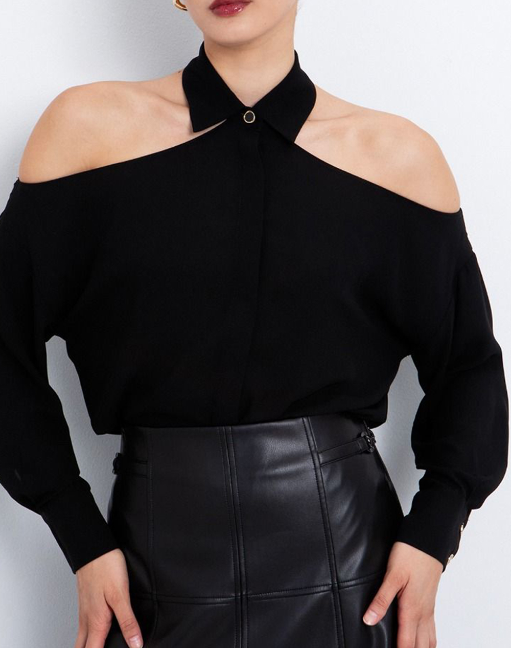 Women's shirt, in a comfortable fit, solid color, long sleeves, with exposed shoulders and button closure. (Composition: 100% Polyester)