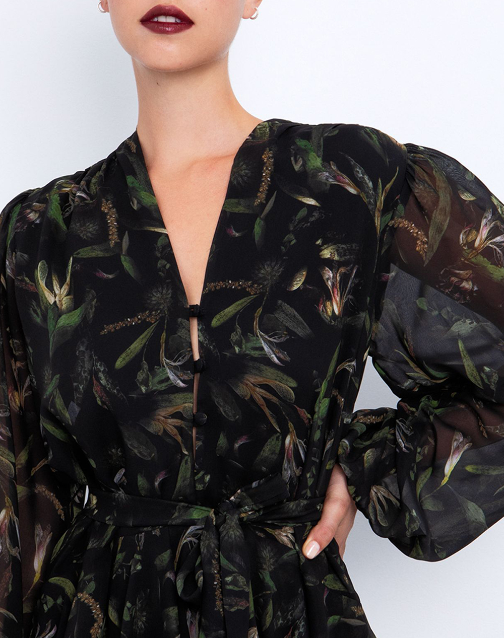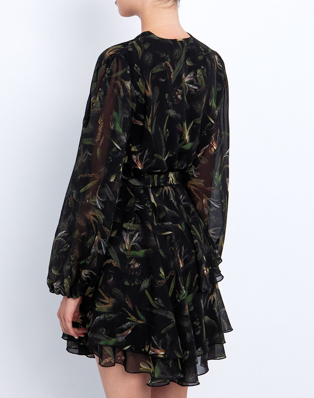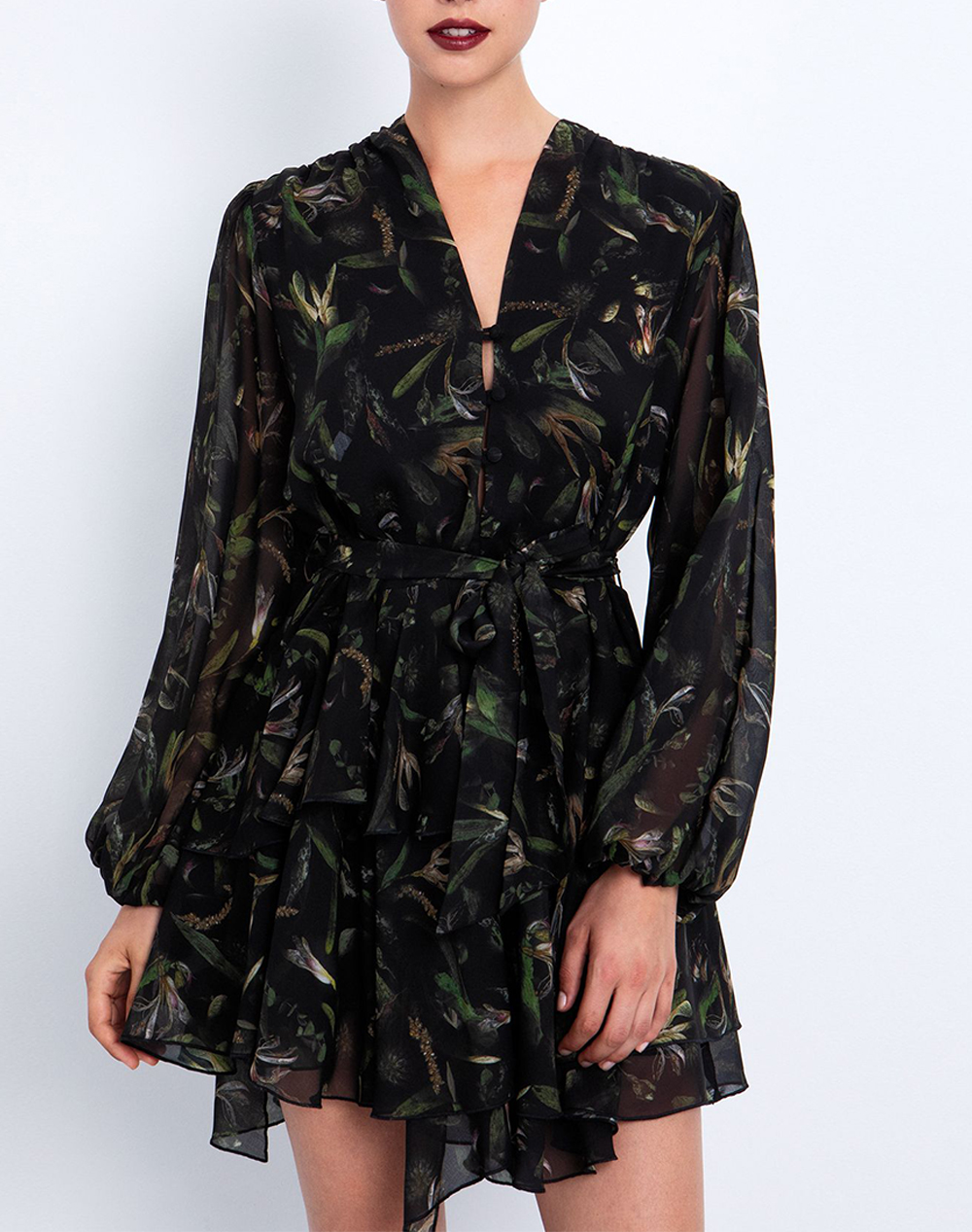 Women's mini dress, long sleeves, with floral pattern, V neckline, with layers at the bottom and elastic waist with matching belt. (Composition: 100% Polyester)