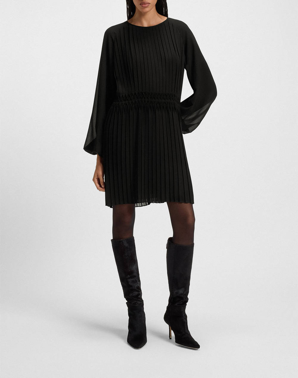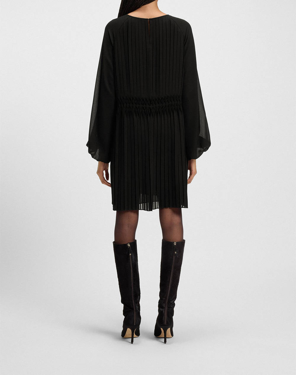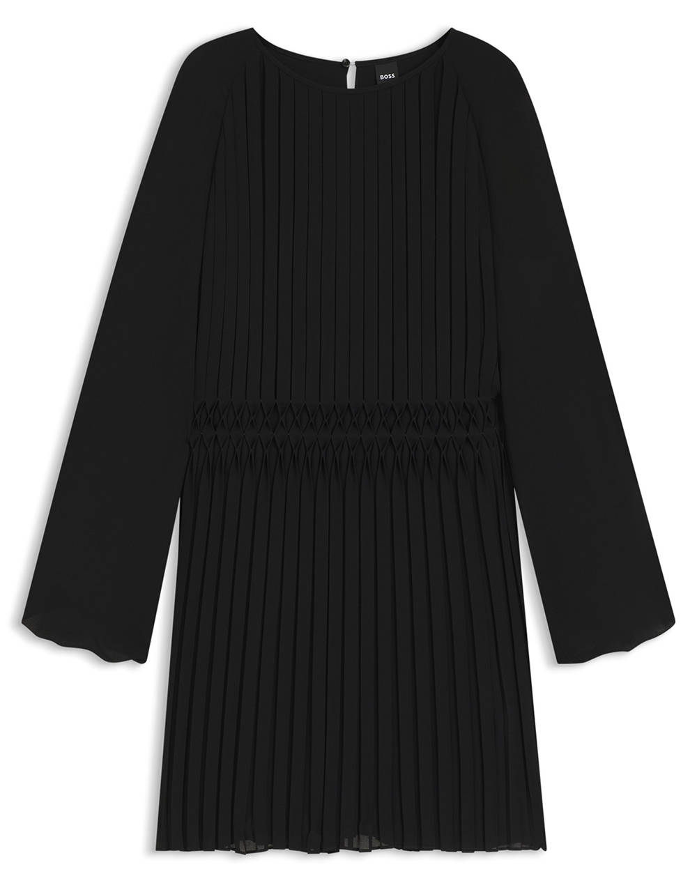 Women's dress, regular fit, long sleeves, round neckline, elastic waist and button closure at the back. (Composition: 100% Polyester)