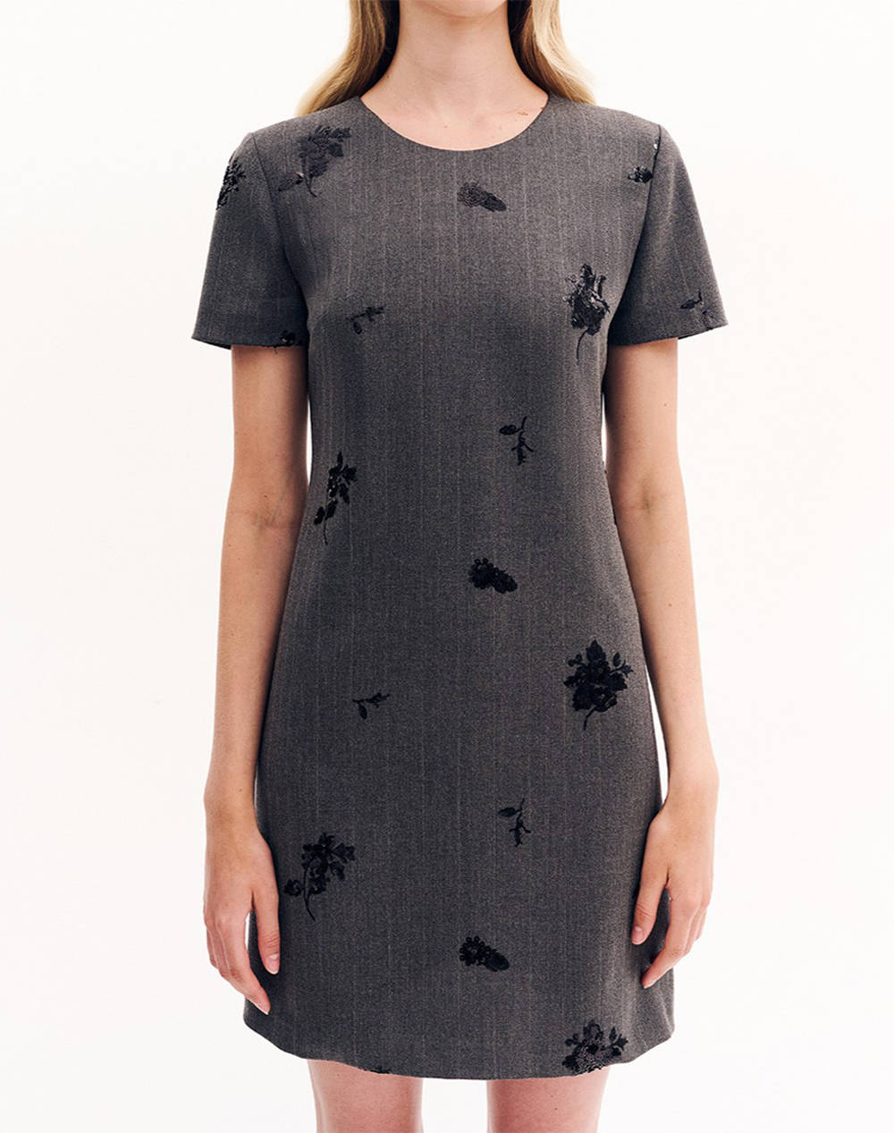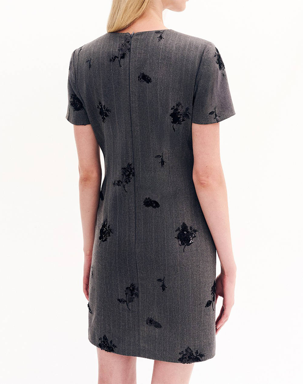 Women's short A-line dress, short sleeves, with striped pattern, sequin flower details and zipper closure on the back. (Composition: 75% Polyamide, 24% Rayon, 1% Elastane)