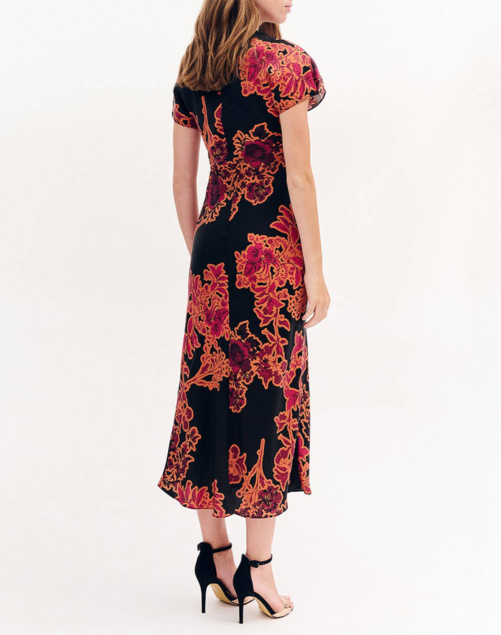 Women's long dress, short sleeves, with a printed pattern, with draped detail on the front and button closure on the back. (Composition: 100% Viscose)