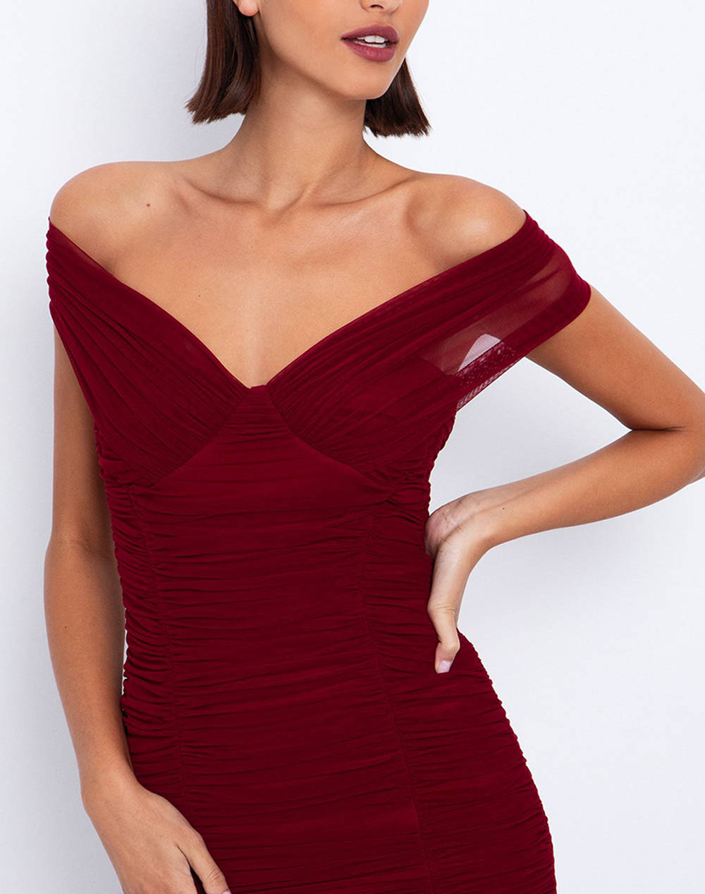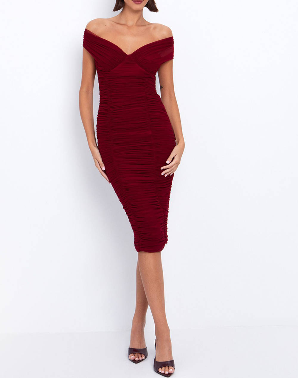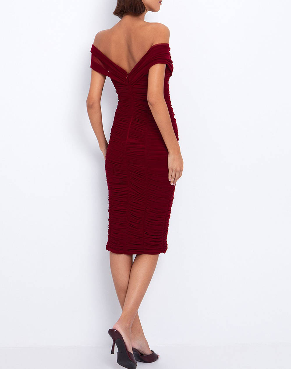 Women's midi dress, fitted, solid color, with exposed shoulders, ruched design, V-neckline and back closure with hidden zipper. (Composition: 92% Polyamide, 8% Elastane)