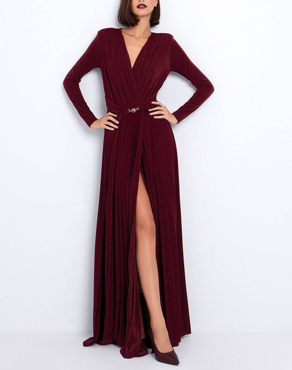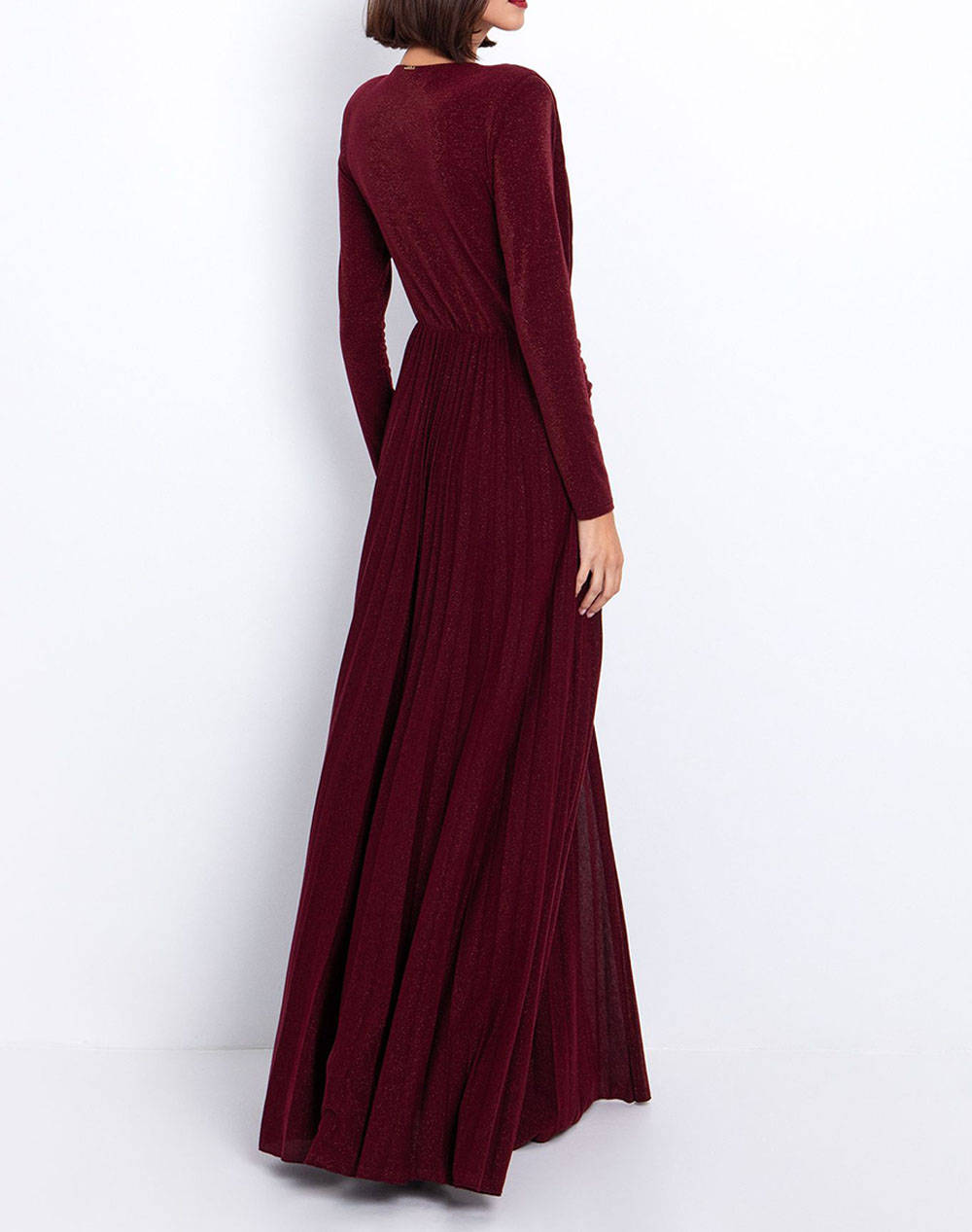 Women's maxi dress, solid color, long sleeves, with "V" neckline, elastic waist and bottom with pleated design and slit. It has a built-in matching bodysuit-slip. (Composition: 45% Polyester, 20% Viscose, 15% Metallic fibers, 15% Polyamide, 5% Elastane)