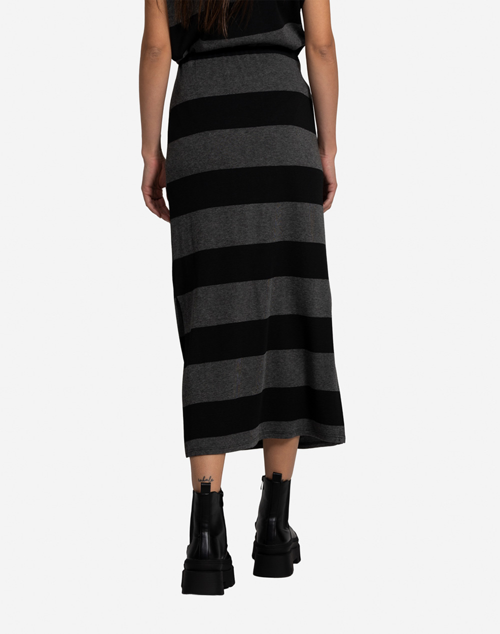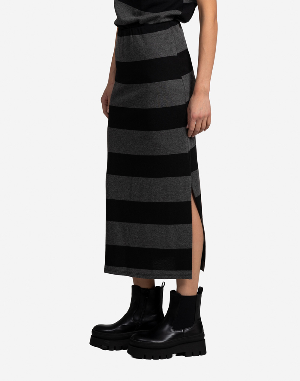 Γυναικεία midi φούστα, σε χαλαρή γραμμή, με ριγέ μοτίβο, άνοιγμα στο τελείωμα και ελαστική μέση. Καλύπτει έως 100εκ. περιφέρεια στη μέση. (Σύνθεση: 95% Βισκόζη, 5% Ελαστάνη)