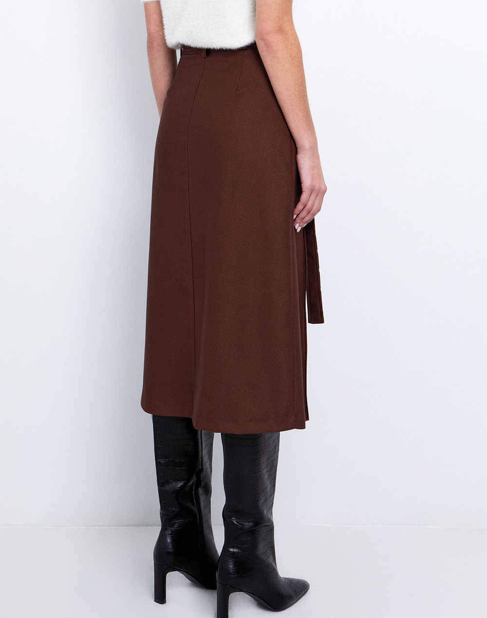 Women's midi skirt, in a flared line, high waist, with pleats on the front, belt at the waist and zipper closure. (Composition: 76% Polyester, 21% Viscose, 3% Elastane)