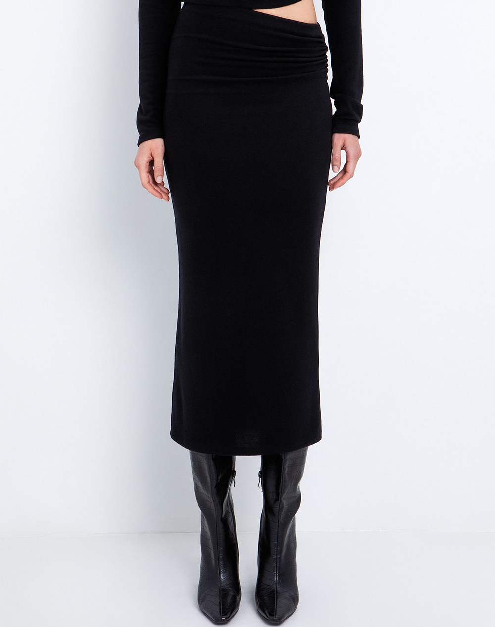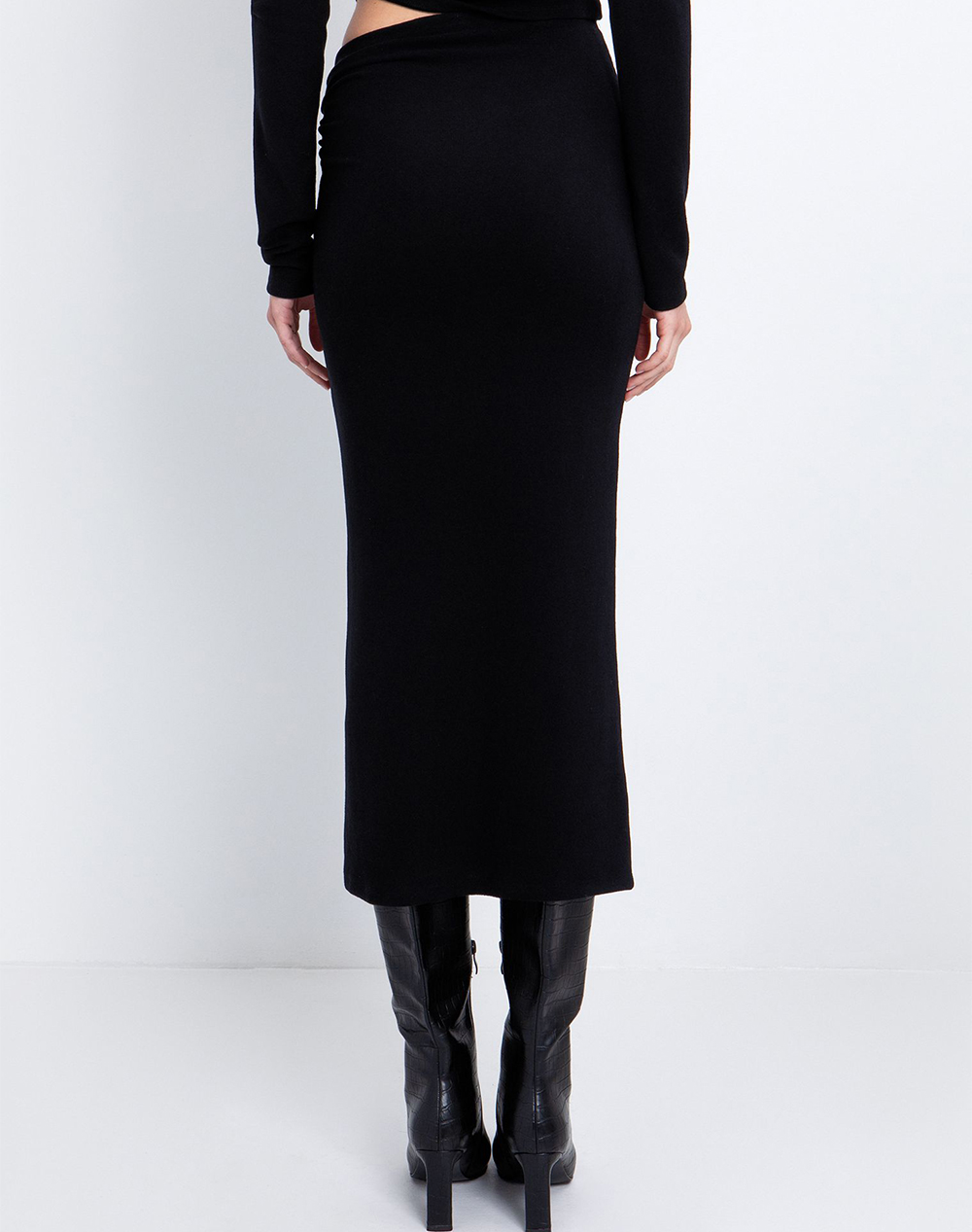 Women's midi skirt, fitted, high-waisted, with a fine knit weave and a design with an asymmetrical frill on the side. (Composition: 80% Viscose, 16% Polyester, 4% Elastane)