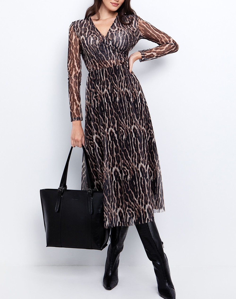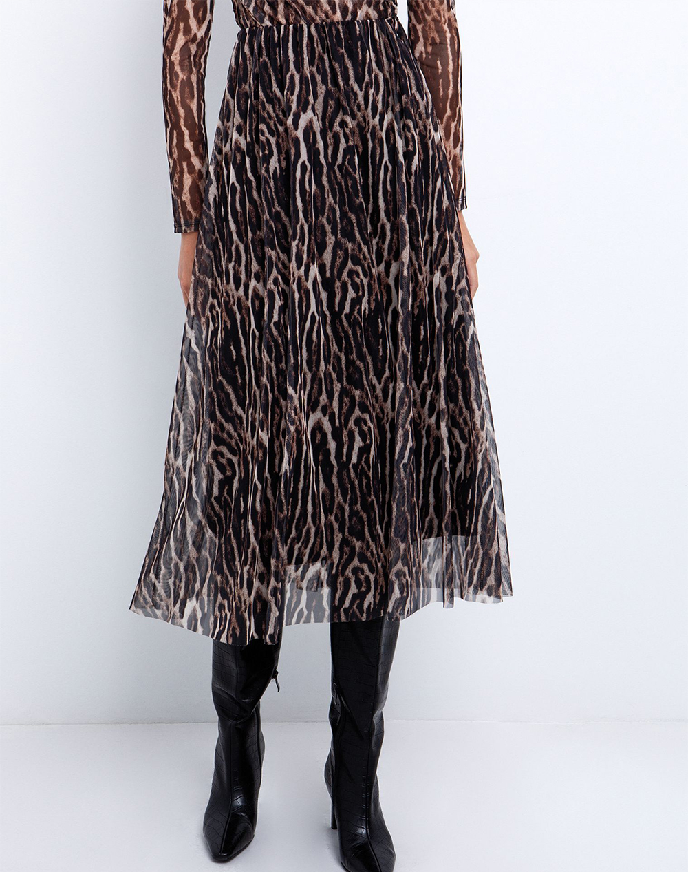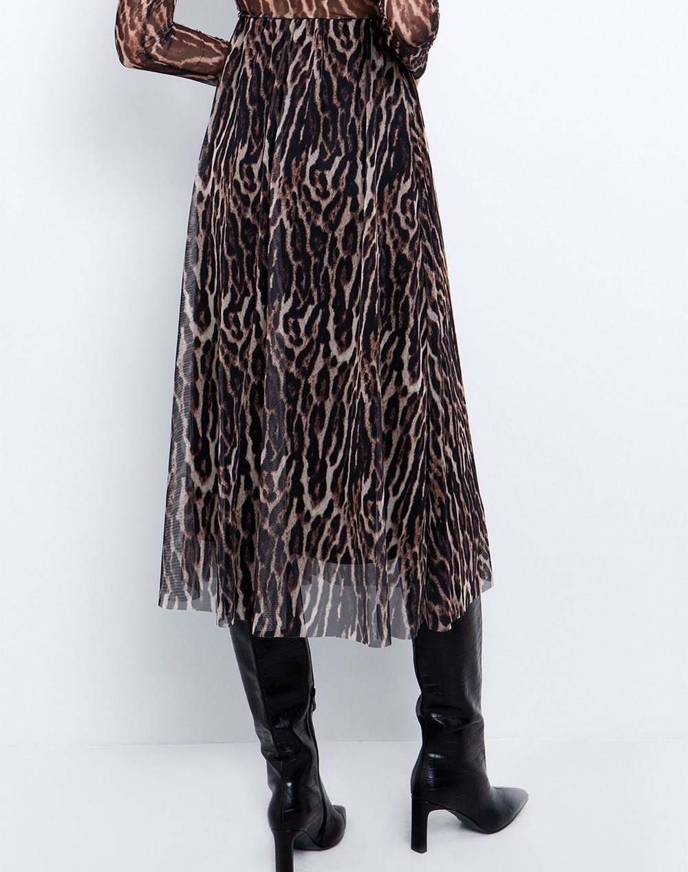 Women's midi skirt, high waisted, with animal-print pattern and internal elastic at the waist. (Composition: 75% Polyester, 25% Elastane)