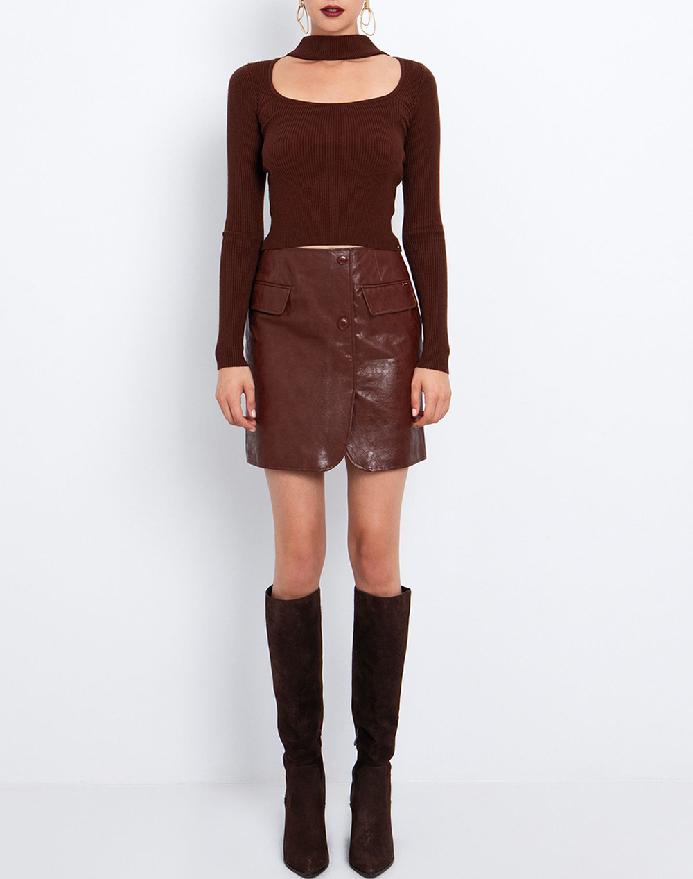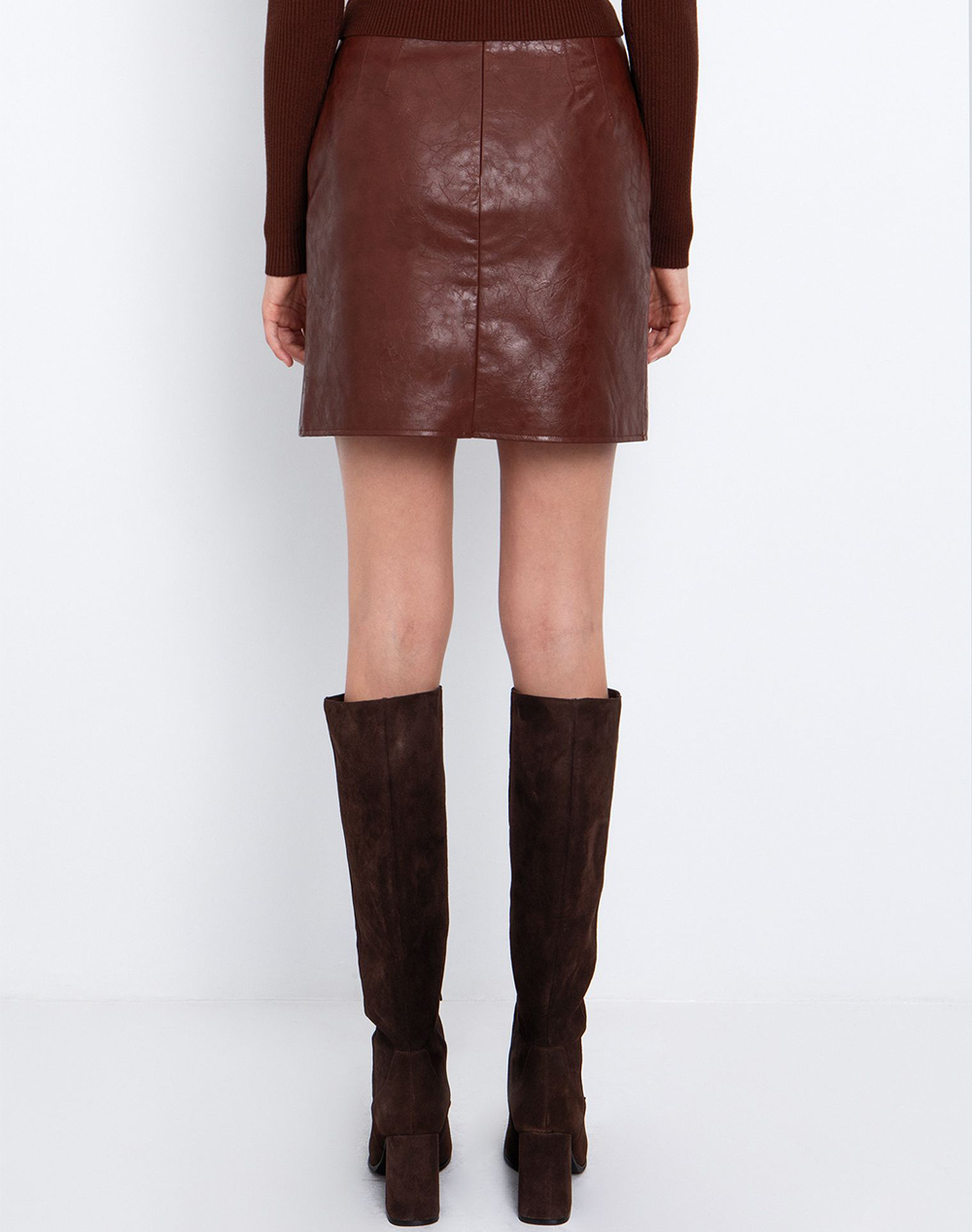 Women's skirt, regular fit, leather, high waist, with front slit and hidden zipper closure at the back. (Composition: 100% Polyurethane)