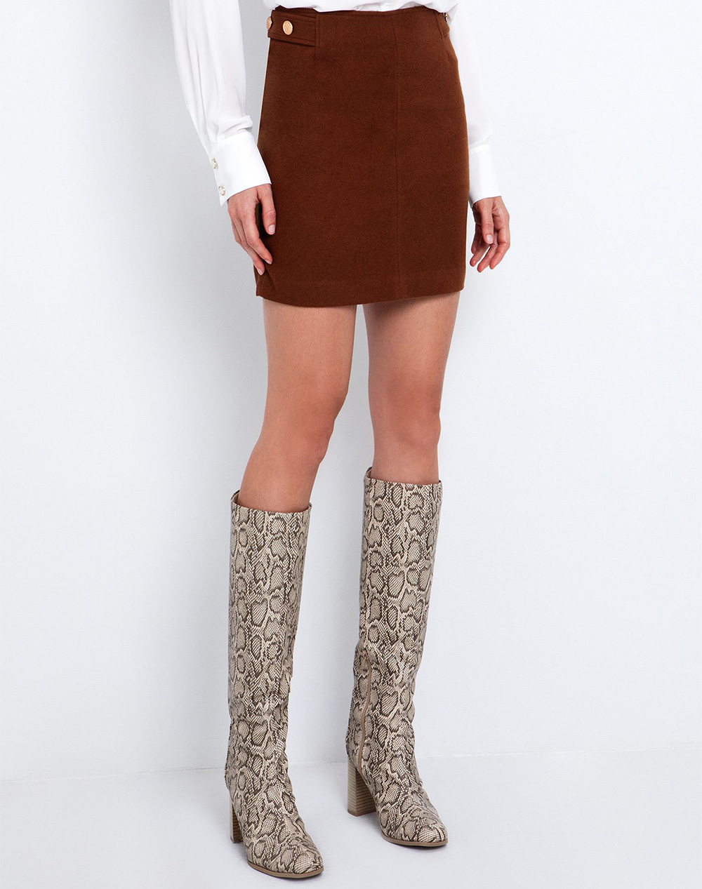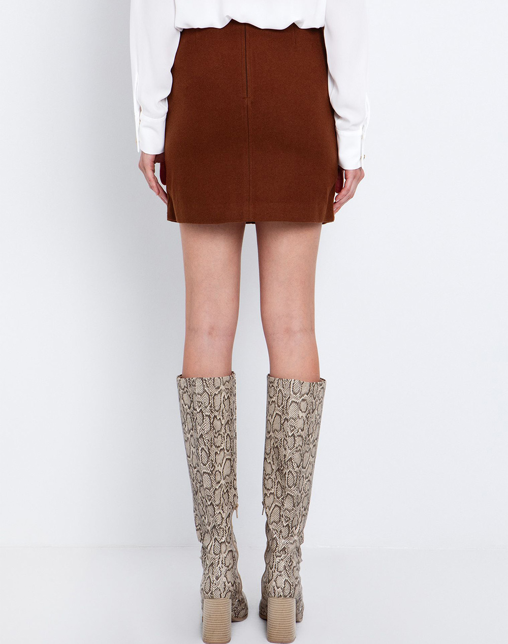 Women's mini skirt, wool, high-waisted, with decorative buttons and hidden zipper closure at the back. (Composition: 60% Wool, 40% Polyester)