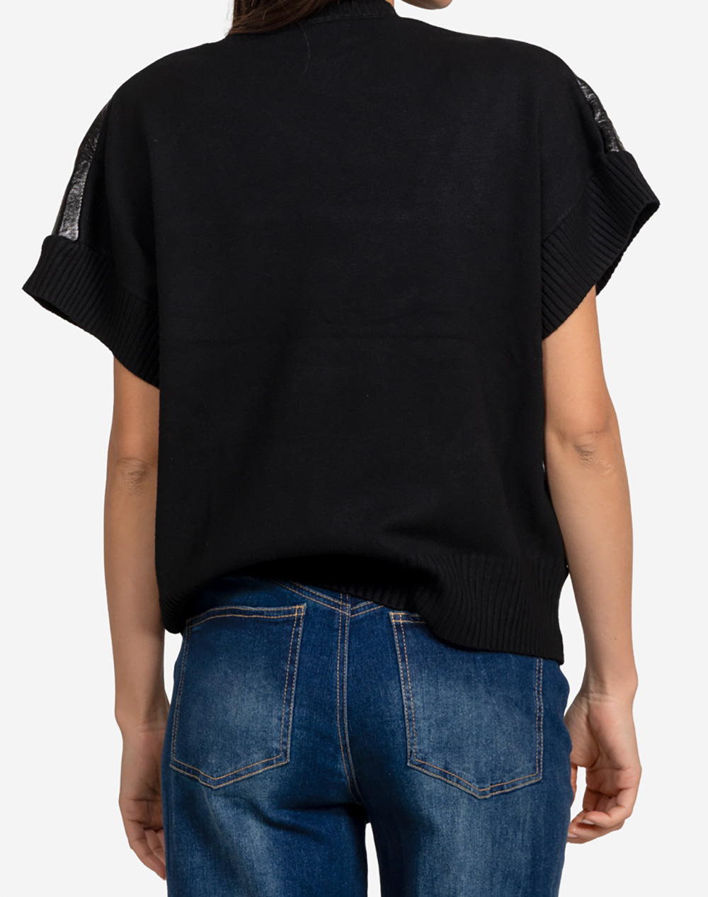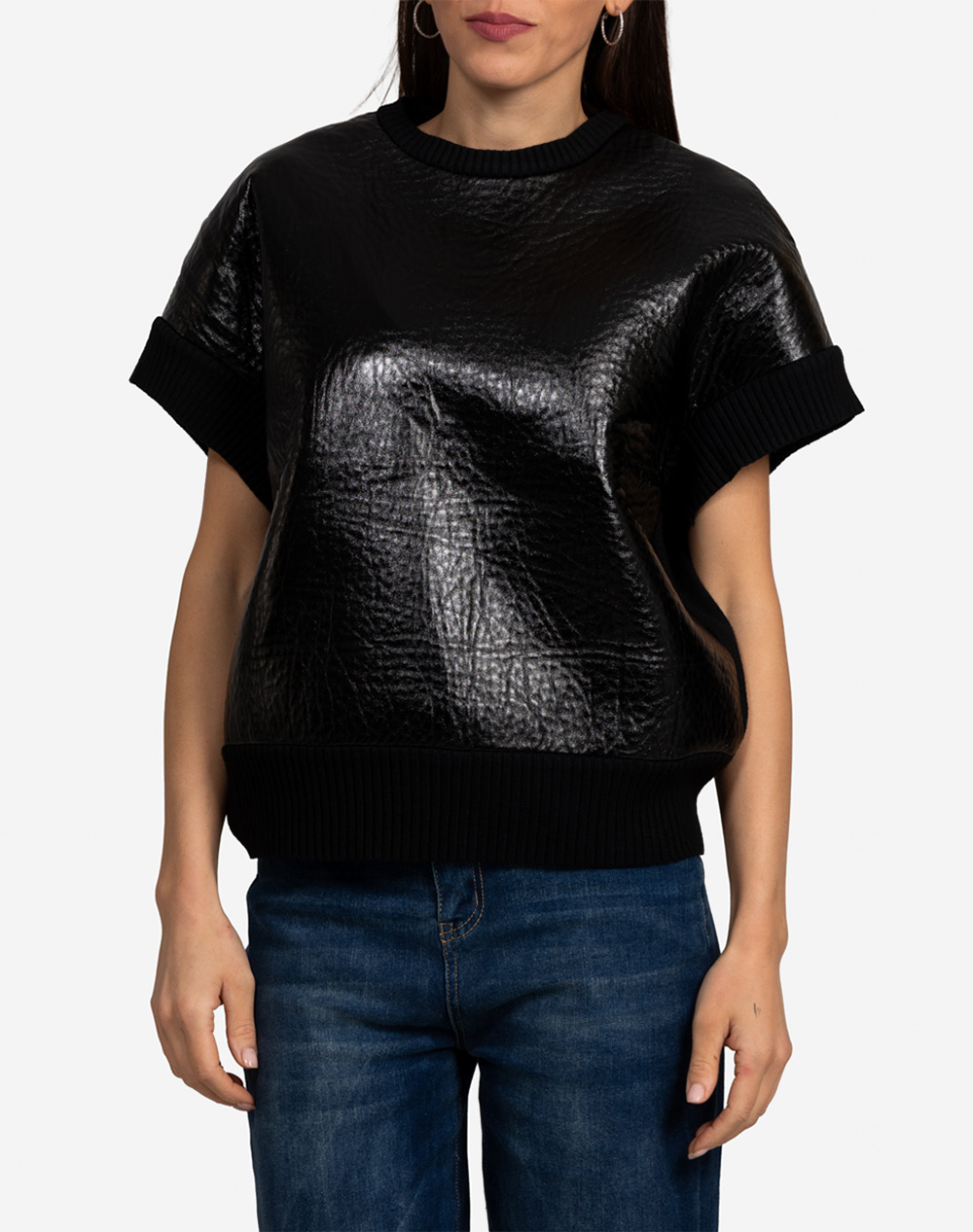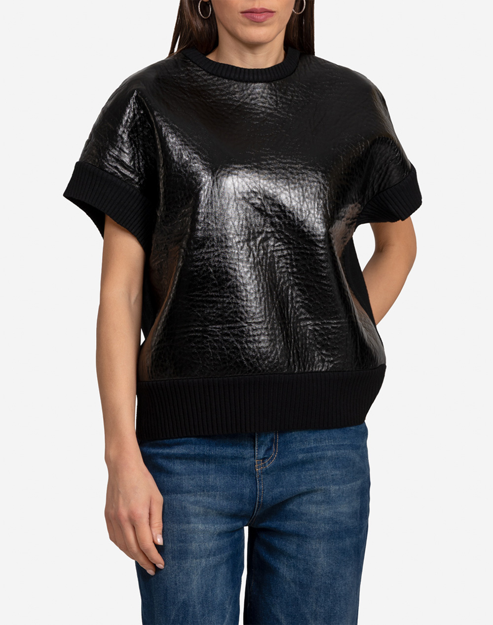Γυναικεία μπλούζα, σε χαλαρή γραμμή, κοντομάνικη, με εφέ δερματίνης μπροστά και πλεκτή ύφανση στο πίσω μέρος. Καλύπτει έως 115εκ. (Σύνθεση: 100% Πολυαμίδιο & 51% Βισκόζη, 39% Πολυαμίδιο, 10% Ελαστάνη)