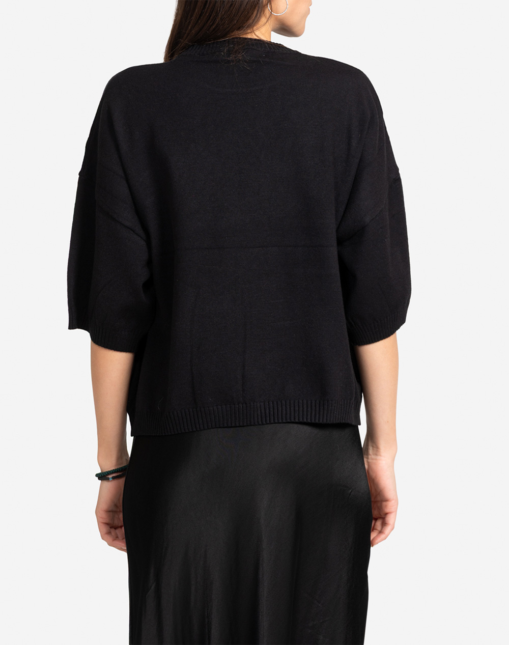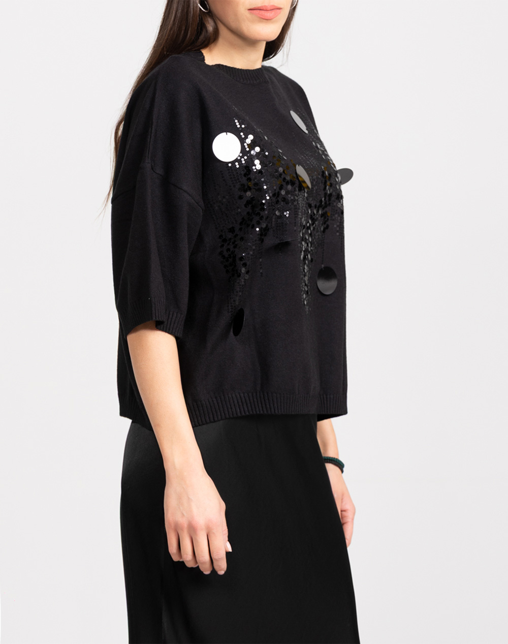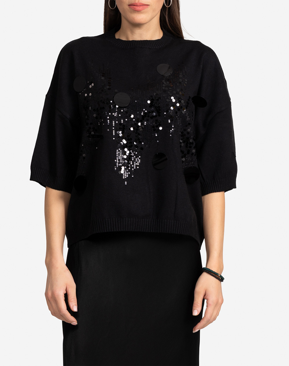 Γυναικεία μπλούζα, με πλεκτή ύφανση, κοντομάνικη, με στρογγυλή λαιμόκοψη και σχέδιο από παγιέτες μπροστά. Καλύπτει έως 115εκ. (Σύνθεση: 51% Βισκόζη, 39% Πολυεστέρας, 10% Ελαστάνη)