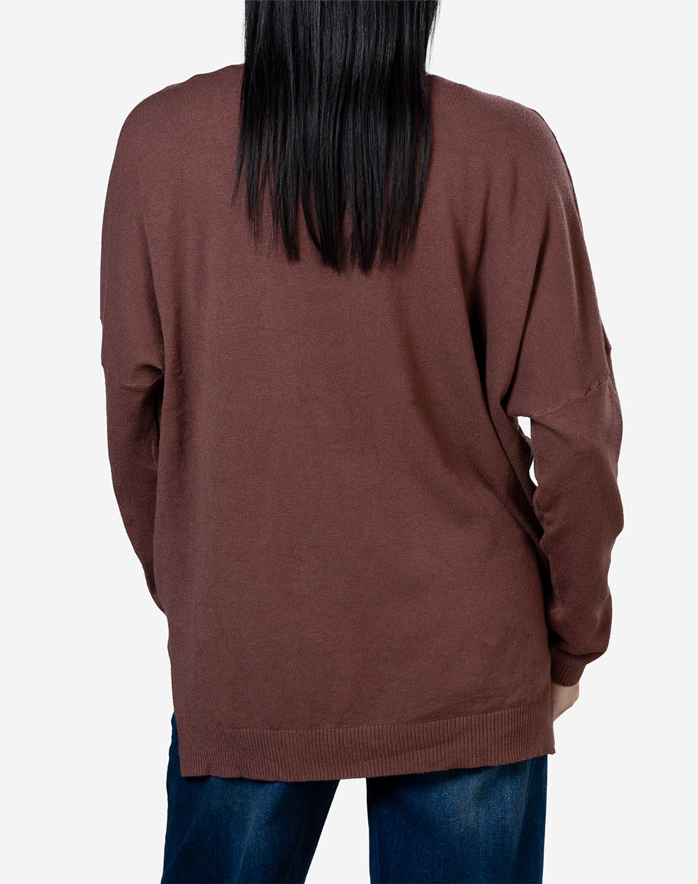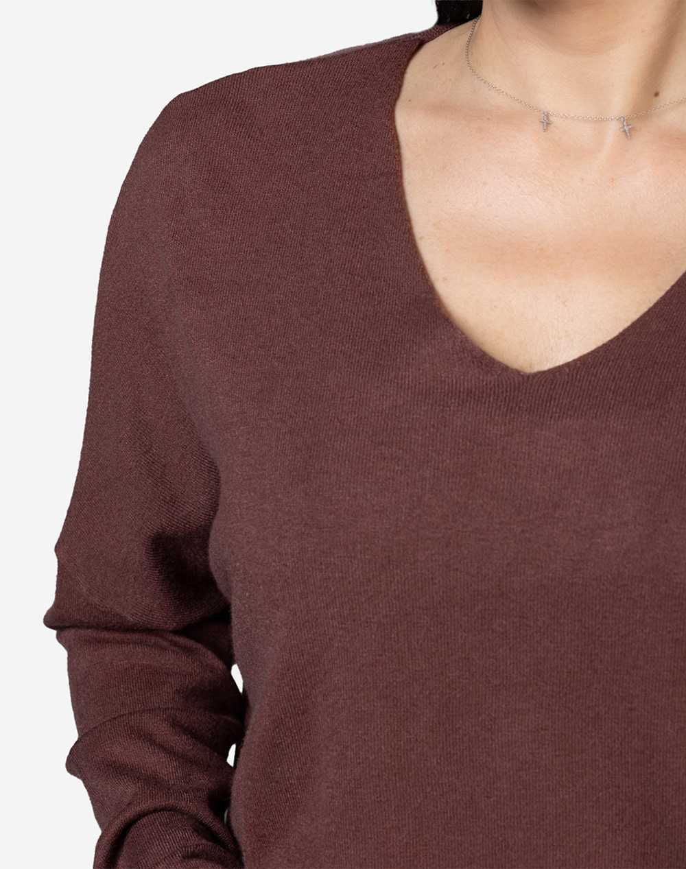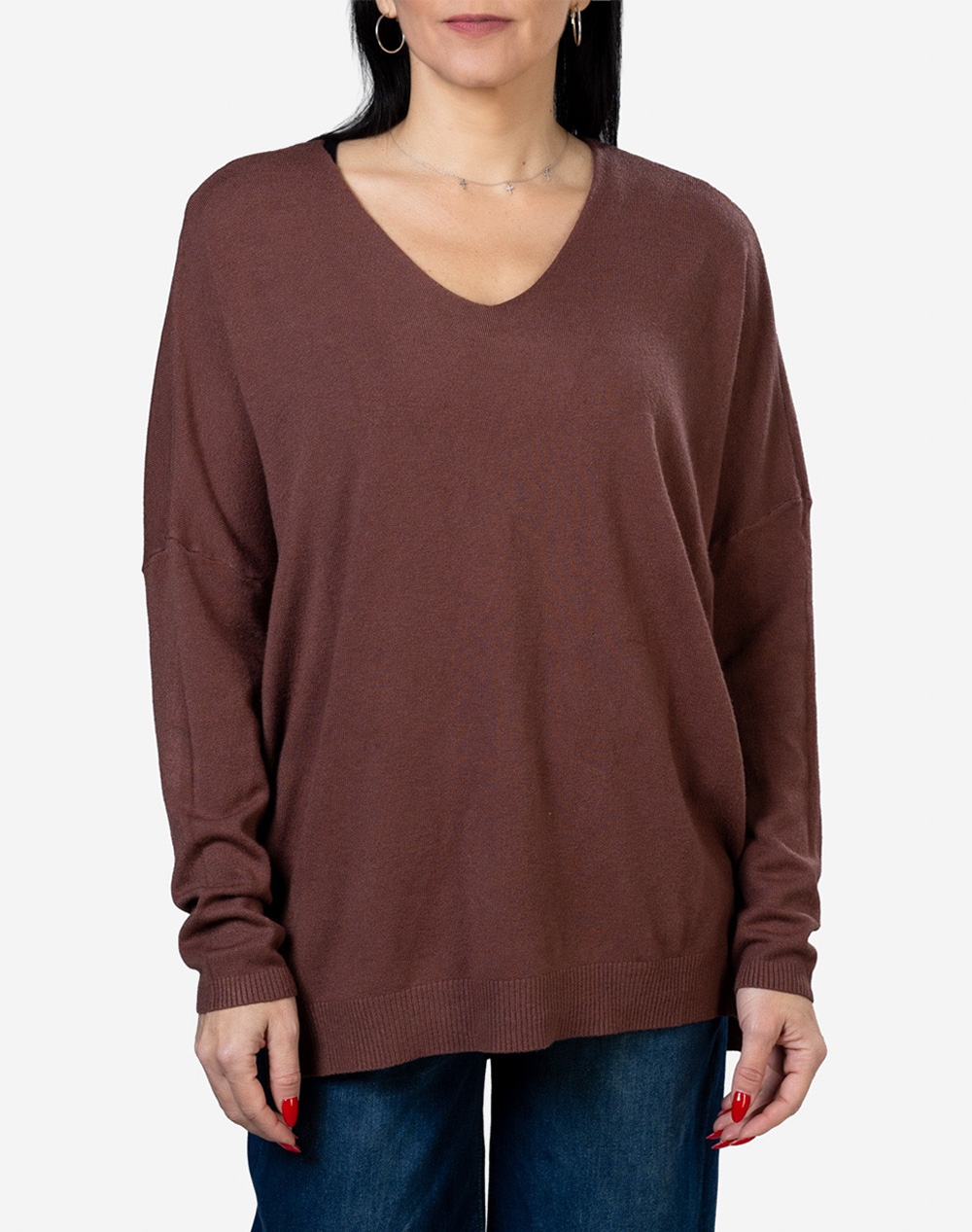 Γυναικεία πλεκτή μπλούζα, σε γραμμή oversized, μακρυμάνικη, με "V" λαιμόκοψη και rib άκρες. Καλύπτει έως 130εκ. περιφέρεια στο στήθος. (Σύνθεση: 55% Βισκόζη, 35% Πολυεστέρας, 5% Ελαστάνη)