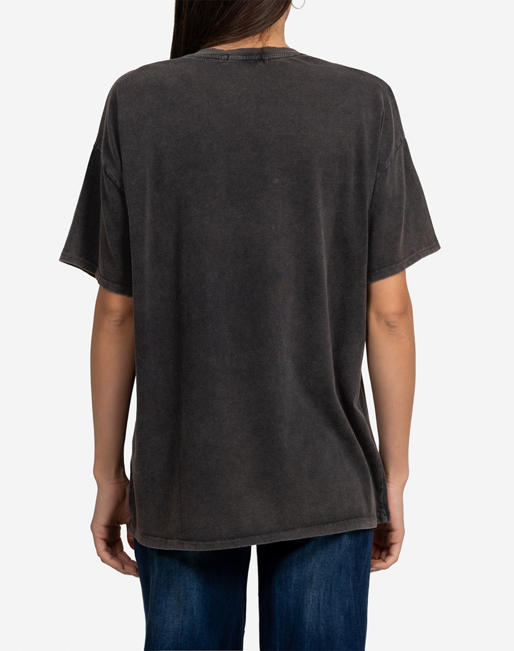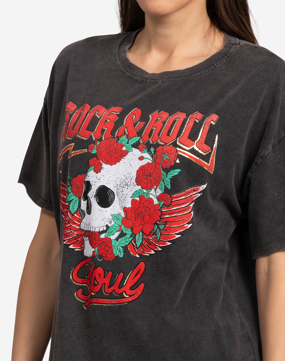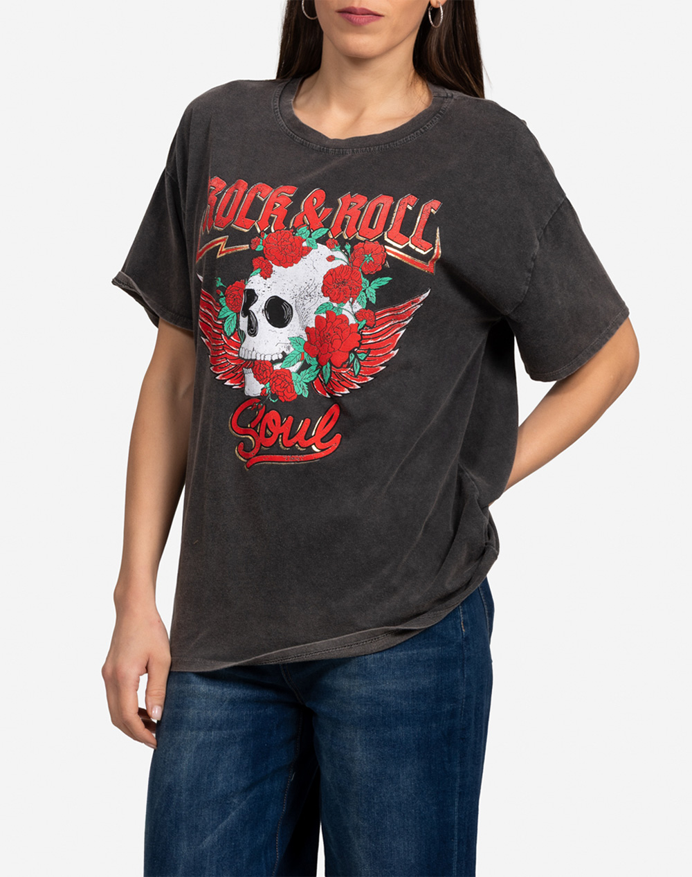 Γυναικεία μπλούζα t-shirt, σε χαλαρή γραμμή, κοντομάνικη, με στρογγυλή λαιμόκοψη και τύπωμα μπροστά. Καλύπτει έως 100εκ. (Σύνθεση: 100% Βαμβάκι)