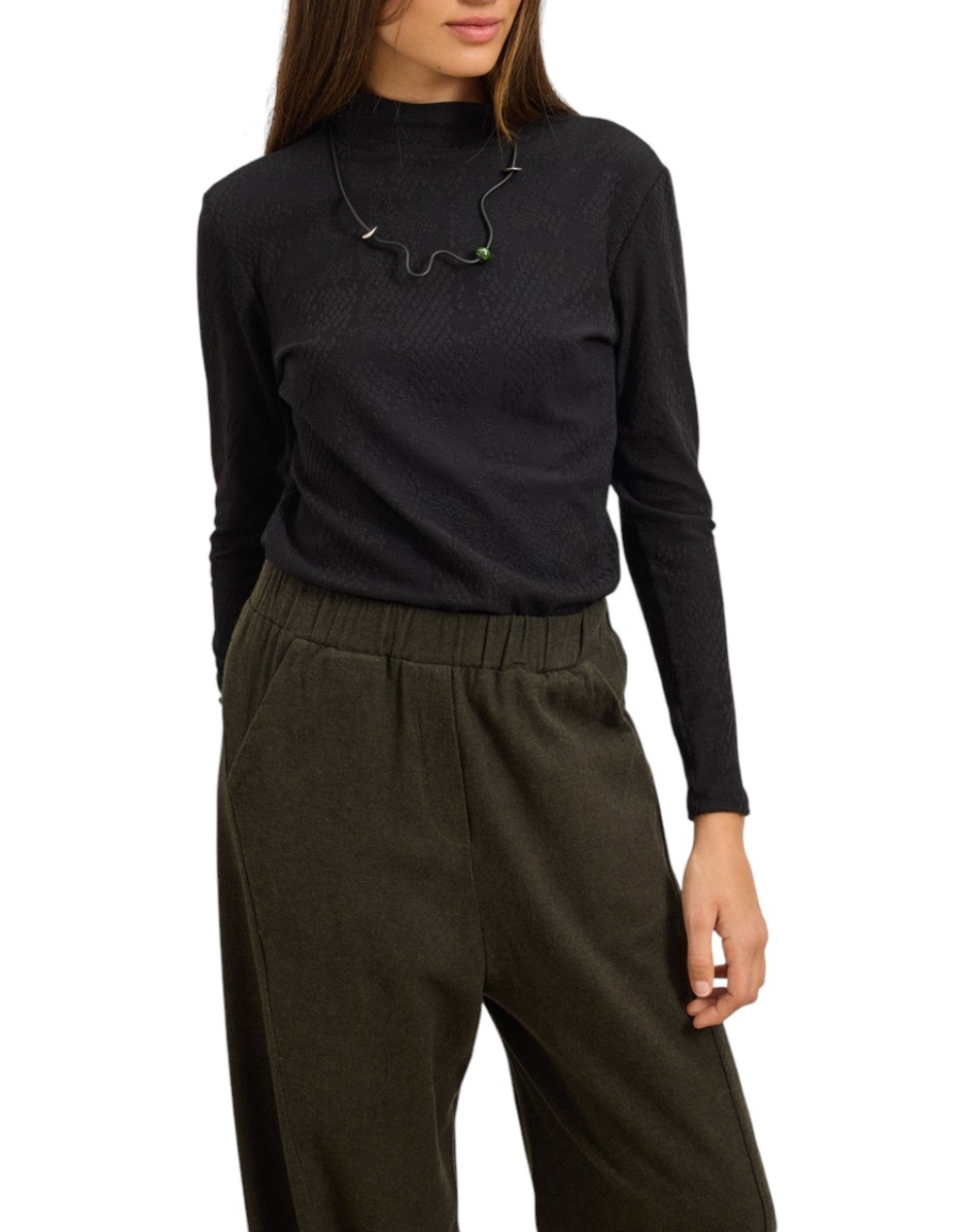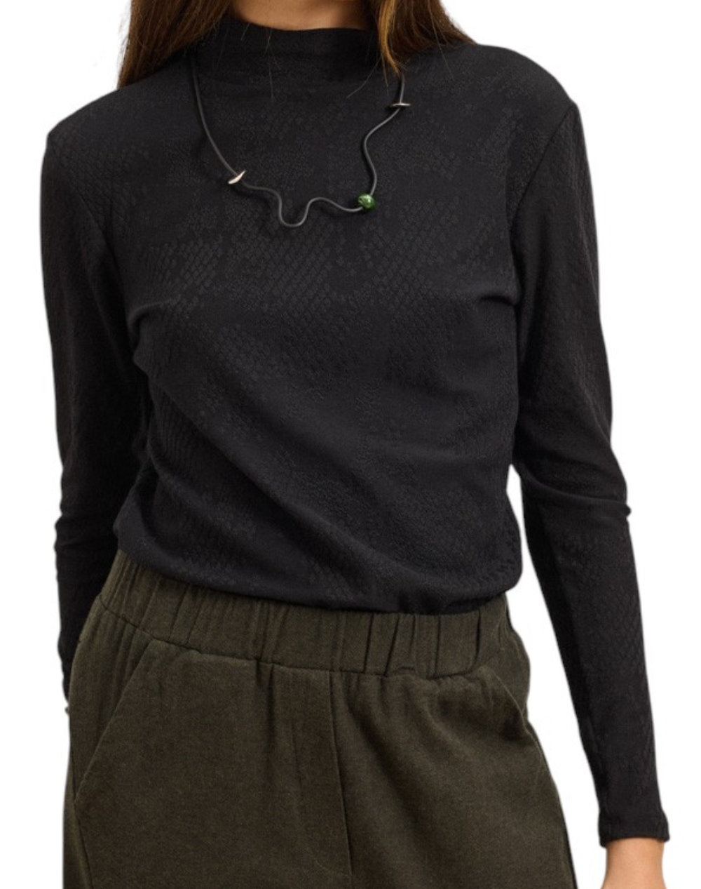 Women's blouse, fitted, long-sleeved, with jacquard pattern and high neck. (Composition: 95% Cotton, 5% Elastane)