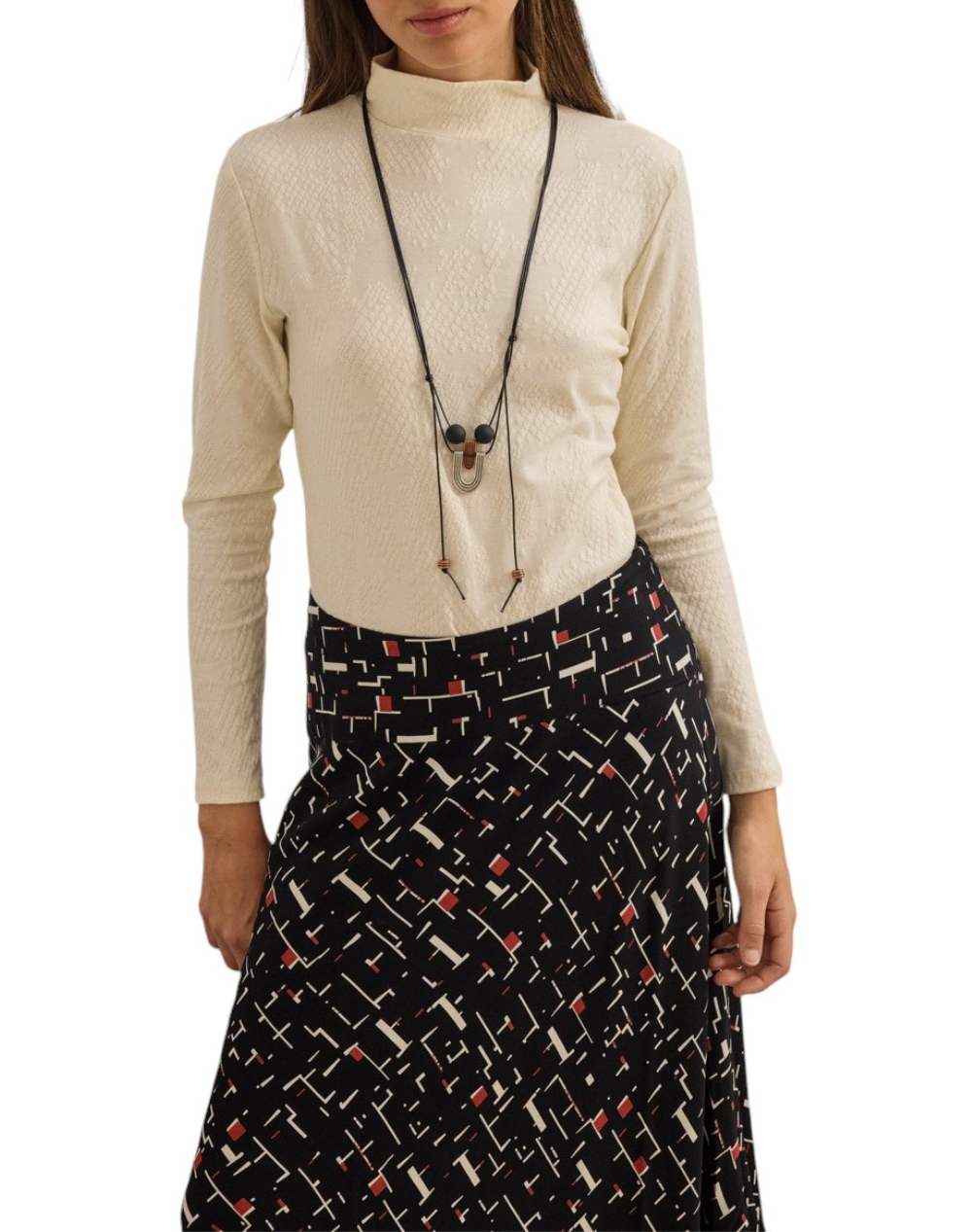Women's blouse, fitted, long-sleeved, with jacquard pattern and high neck. (Composition: 95% Cotton, 5% Elastane)
