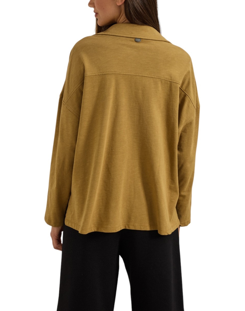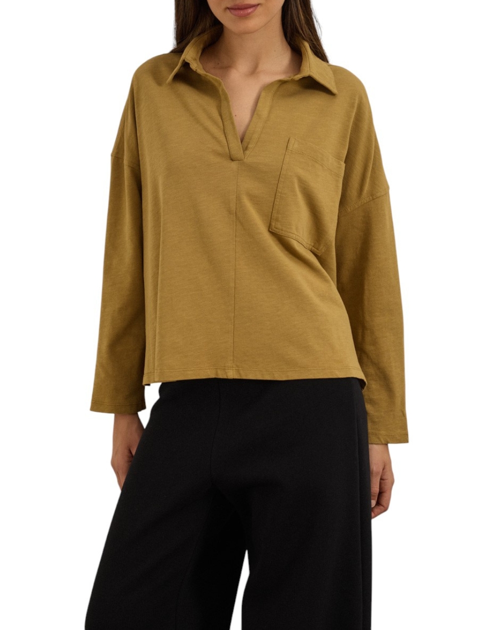 Women's blouse, in a comfortable fit, long sleeves, with a V-neckline, classic collar and front pocket. (Composition: 100% Cotton)