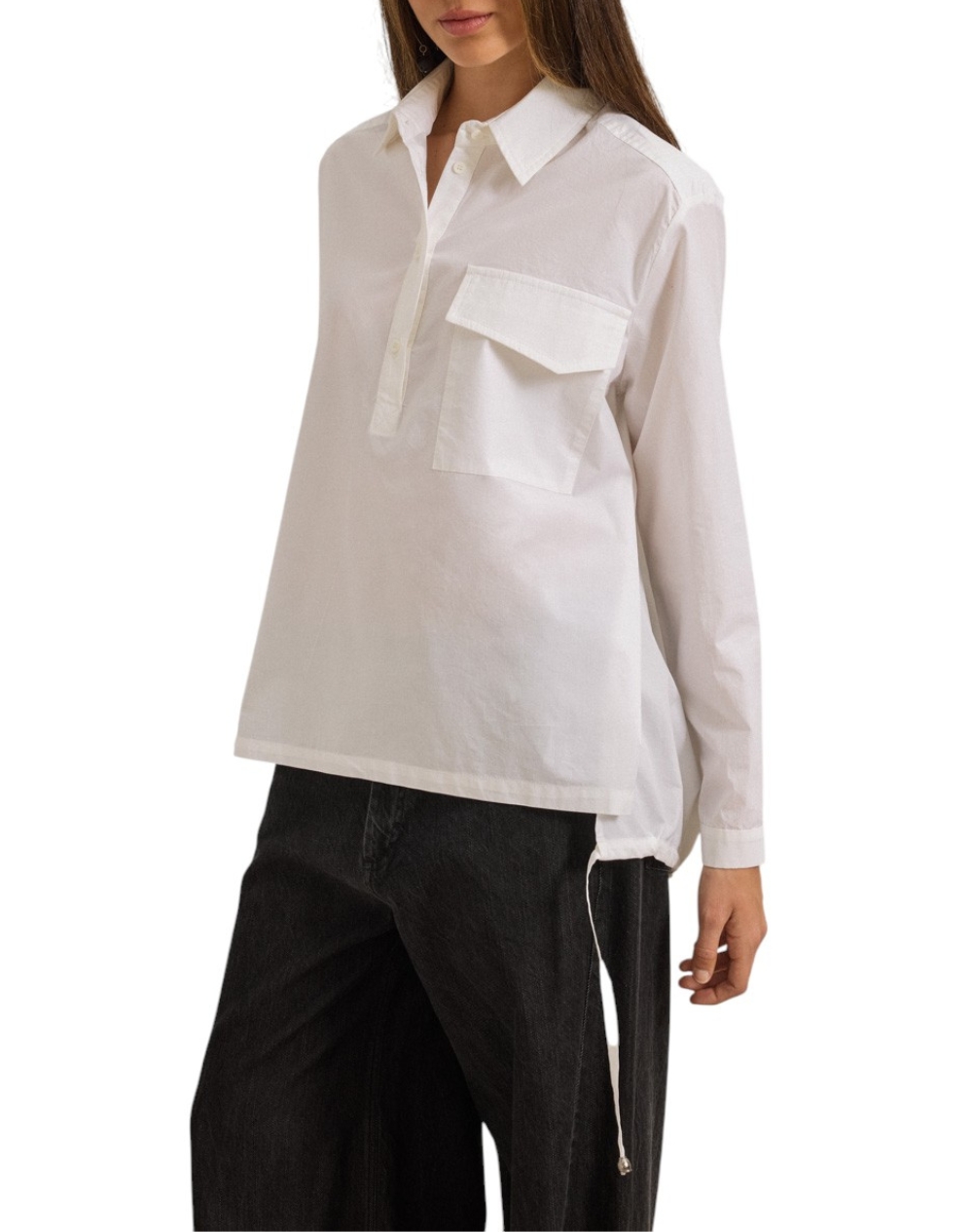 Women's tunic, in a comfortable fit, long sleeves, asymmetrical, with a classic collar, front pocket, front buttons and side openings. (Composition: 100% Cotton)