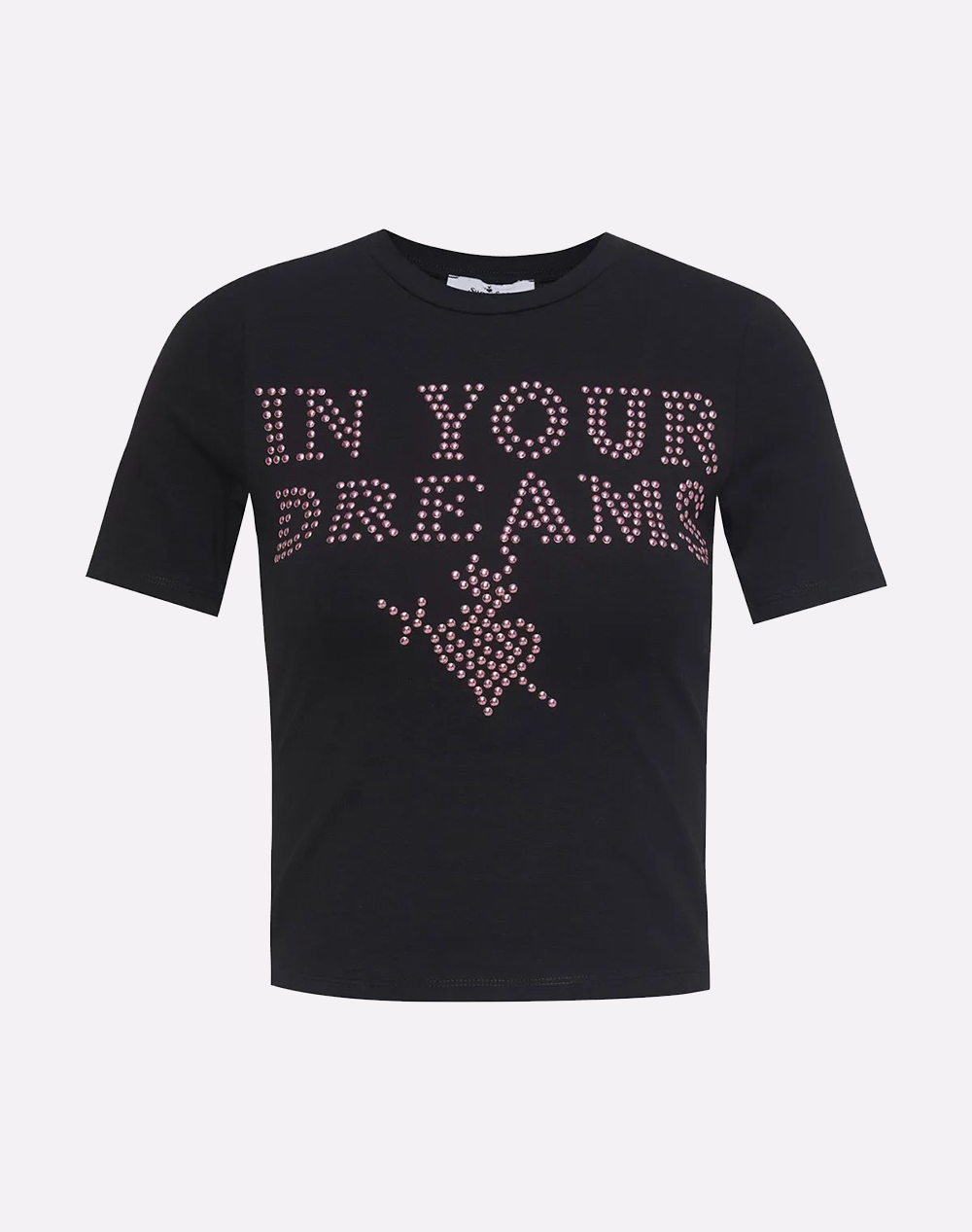 Women's t-shirt, slim fit, short sleeves, round neckline and rhinestone design on the front. (Composition: 95% Cotton, 5% Elastane)
