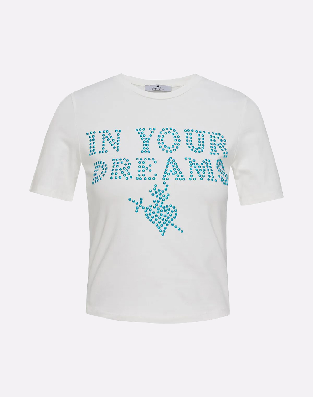 Women's t-shirt, slim fit, short sleeves, round neckline and rhinestone design on the front. (Composition: 95% Cotton, 5% Elastane)