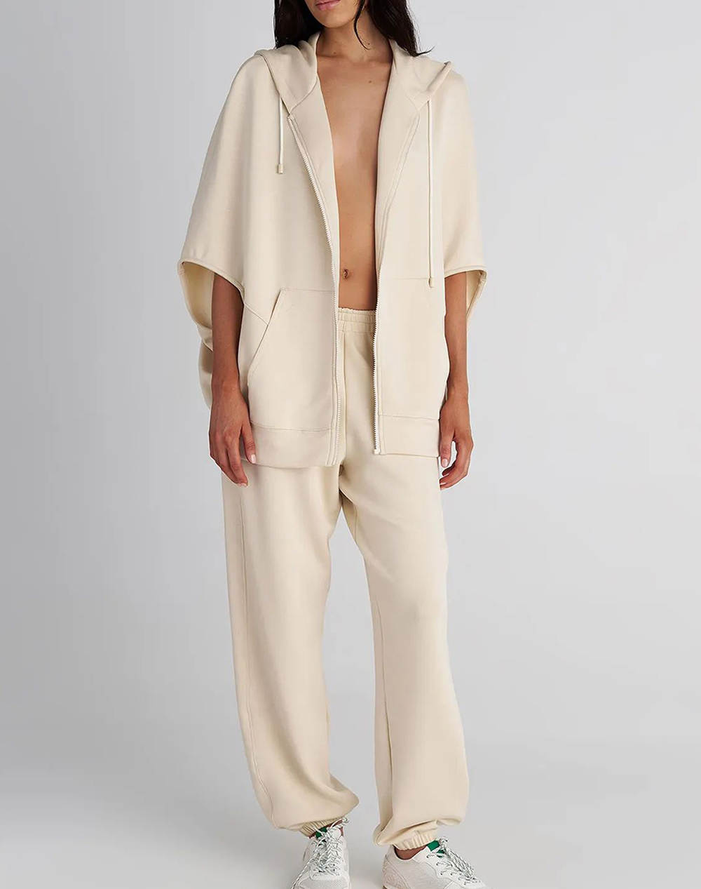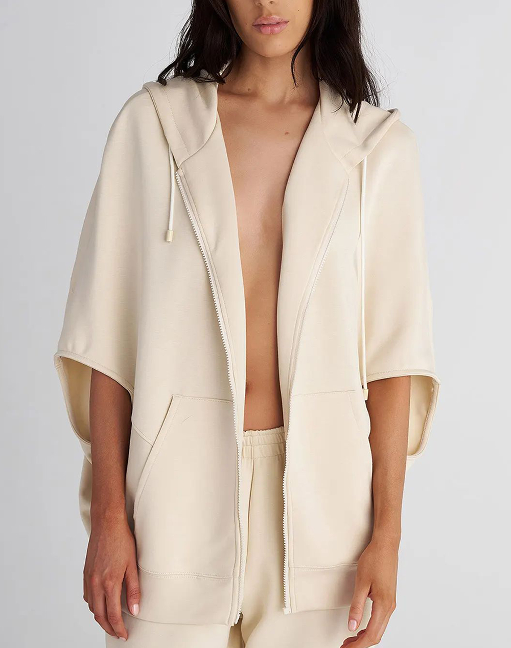 Γυναικεία ζακέτα φούτερ, σε άνετη γραμμή, μονόχρωμη, με μανίκια 3/4, κουκούλα με ρυθμιζόμενο κορδόνι, μπροστινές τσέπες καγκουρό και κλείσιμο με φερμουάρ. (Σύνθεση: 51% Rayon, 43% Πολυεστέρας, 6% Spandex).